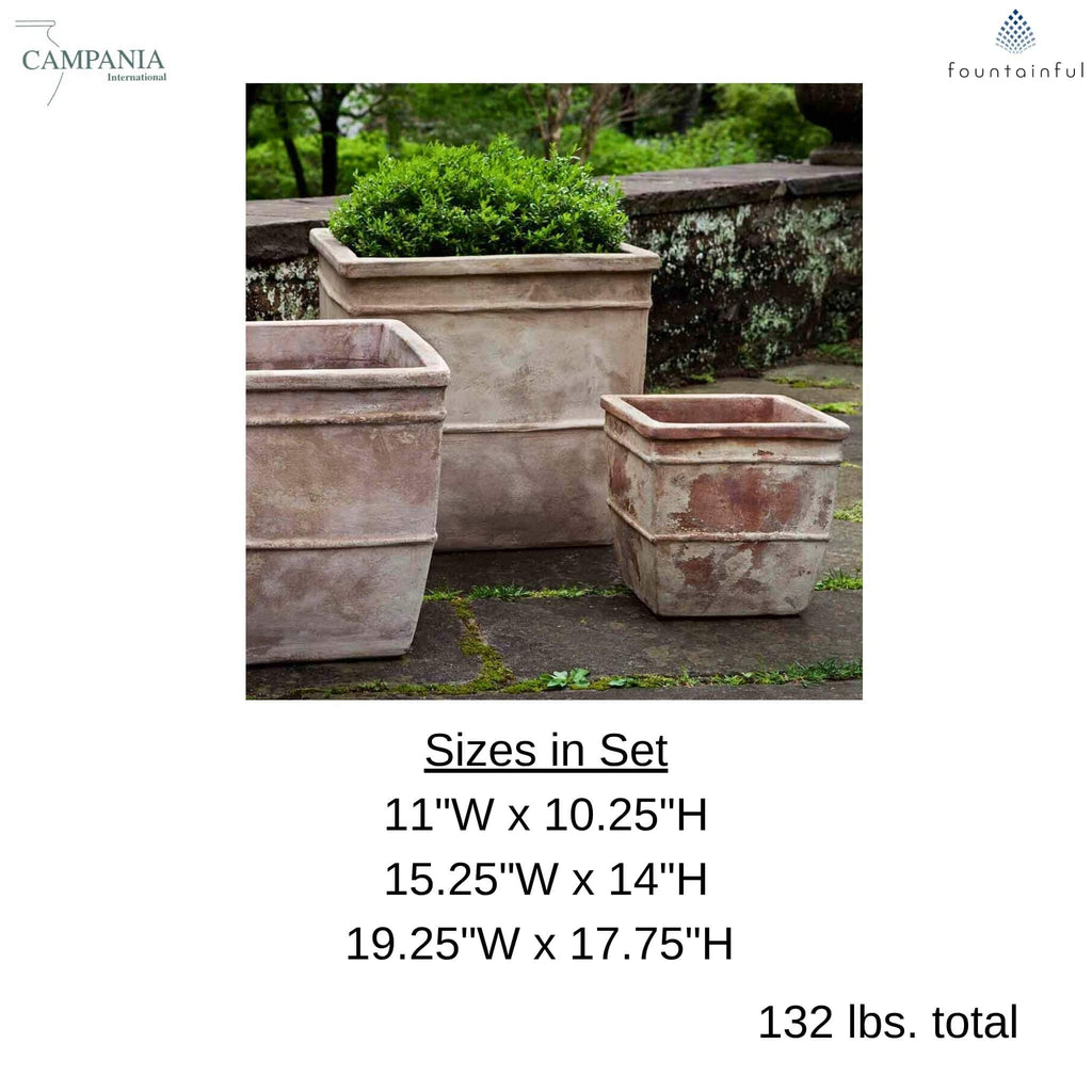 The Antico Square Planter Set by Campania features a minimalist design with two subtle beveled trims around the surface. Enjoy the rustic charm and craftsmanship of this 132-pound terra cotta planter set. Display on your patio, porch, garden, and more!