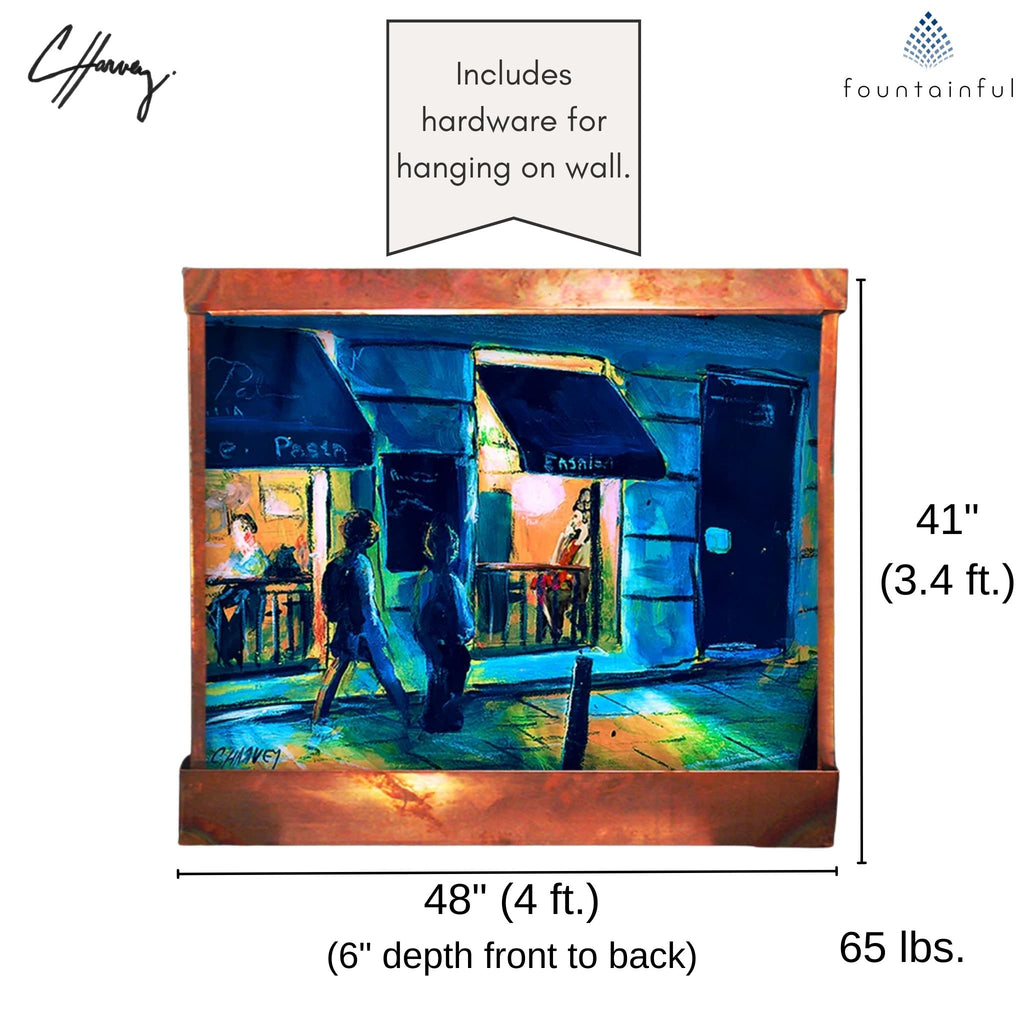 Inspired by the artist's trip to Barcelona's Gothic District, the Barcelona Nights Wall Fountain by Cameron Harvey depicts a fleeting moment right after it had rained. A woman in red, sitting in a cafe and framed by the glowing light of its window. The backsplash is acrylic, while the copper and bronze trim offers versatile placement options whether your décor is modern, rustic, or neutral.