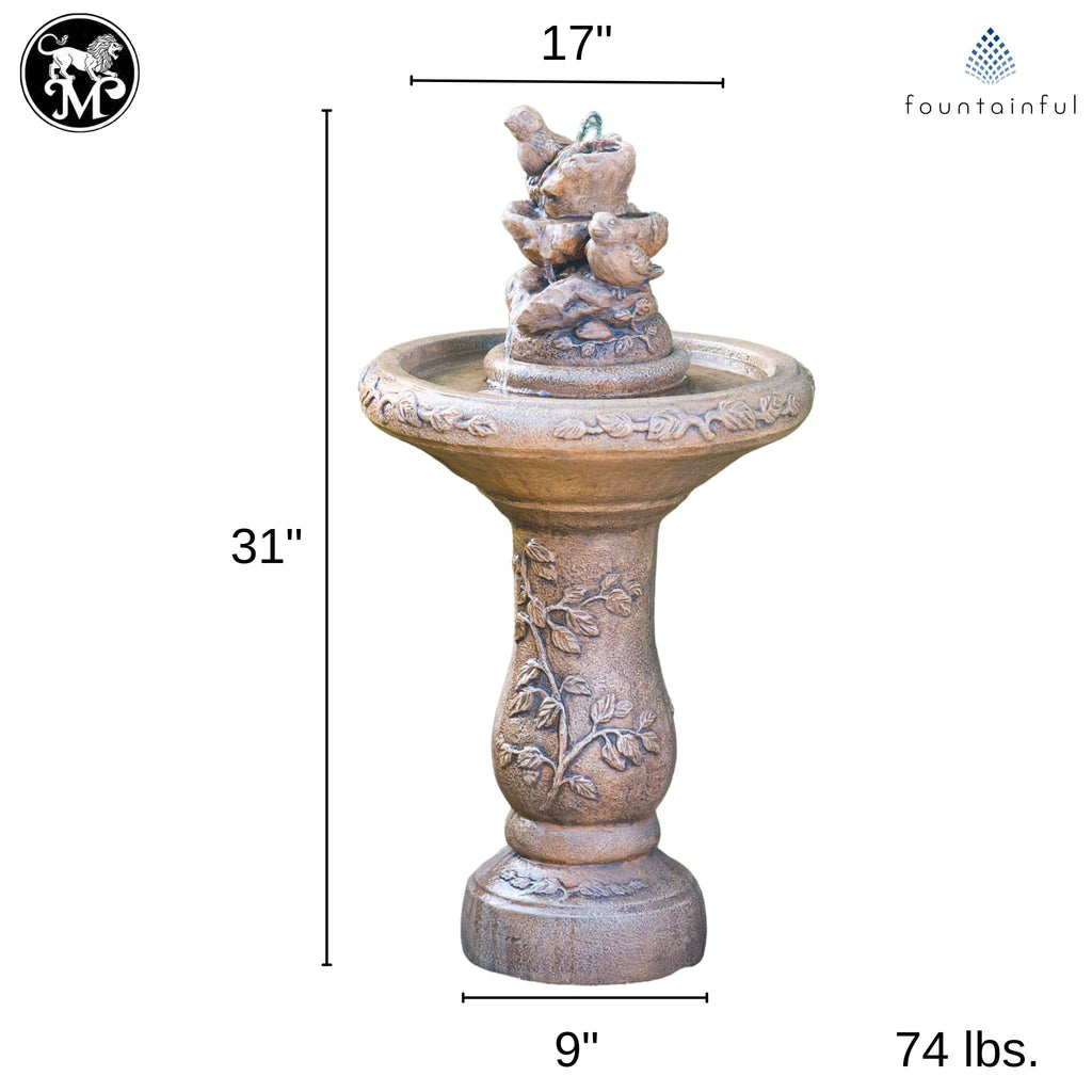 Water bubbles up from the waterspout and cascades down multiple tiers into the pool. The gentle ambient sounds of the Birds on Rock Concrete Fountainette promote peace and wellbeing.