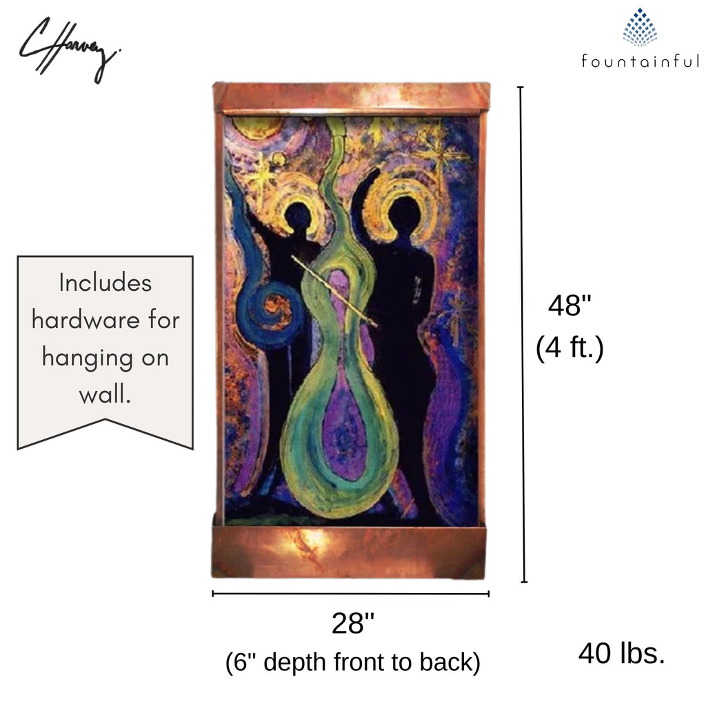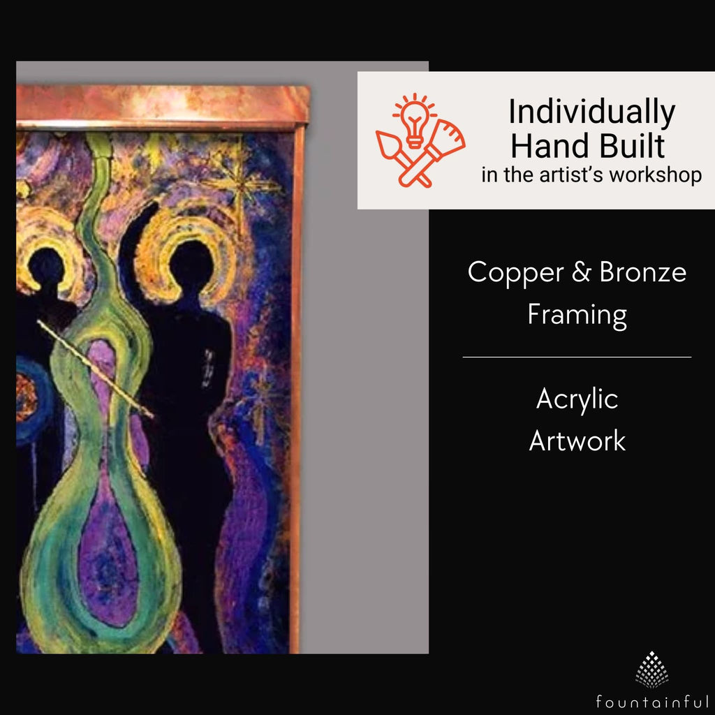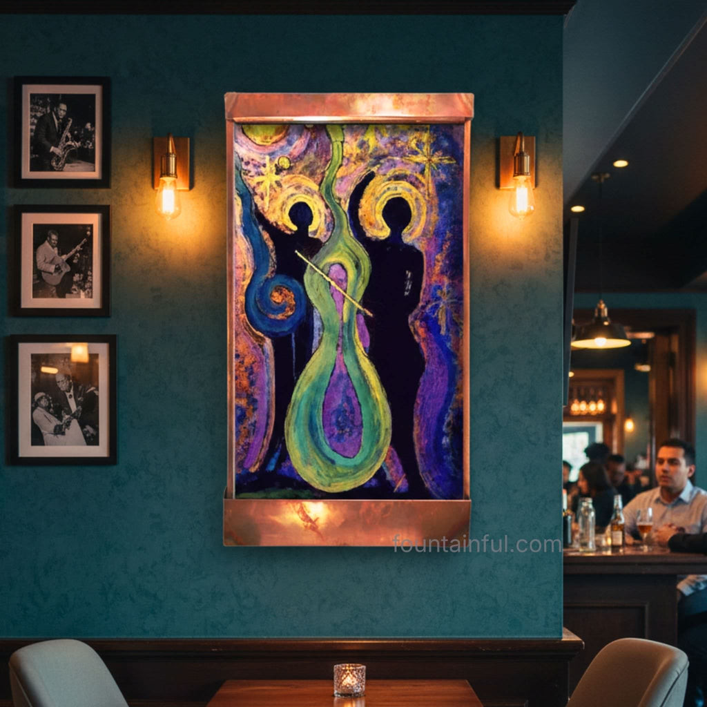 Echoing the late-night soul of Blues music, the Blues in the Night Wall Fountain by artist Cameron Harvey captures an intimate moment between two musicians, suspended in rhythm and reflection. A luminous acrylic backsplash enhances depth and movement, while copper and bronze accents frame the piece with warmth and timeless character.