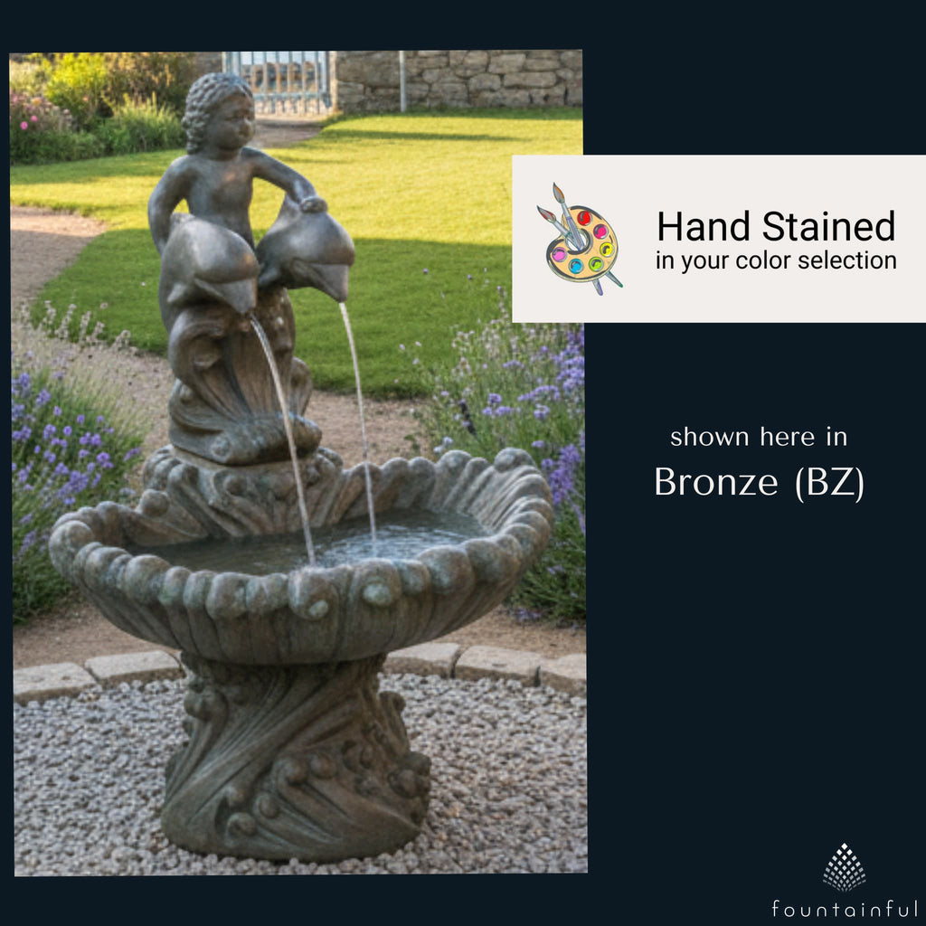 The Boy on Dolphins Fountain by Fiore Stone features a pair of masterfully sculpted dolphins with a boy mounted from behind. The pedestal and shell-inspired bowl feature intricate scrollwork and adornments. Water flows out from each dolphin's mouth, creating a beautiful central focal point.