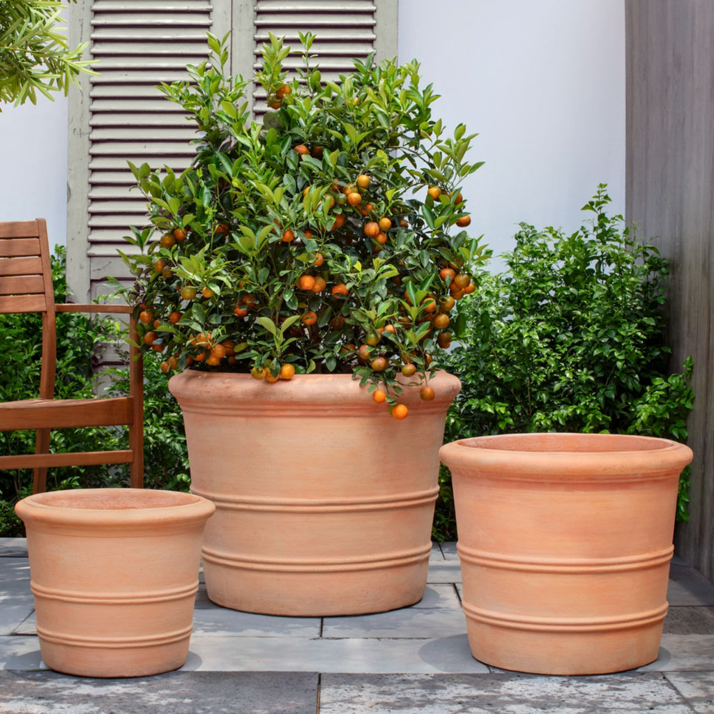 The Classic Orangerie Planter Set by Campania features a light, earthy color tone. The surface is minimally ornamented by two series of beveled line. Enjoy the rustic charm and craftsmanship of this 129-pound terra cotta planter set. Display on your patio, porch, garden, and more!