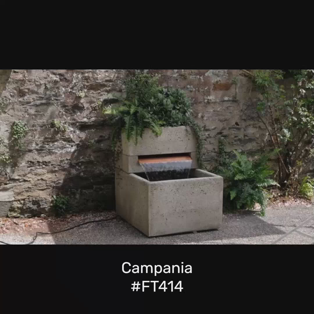 The Oasis Planter Fountain by Campania features a streamlined "stacked block" design with a planter box at its top. Water flows out from the copper spillway and creates a central focal point when viewed from the front, making this an ideal wall fountain as well.