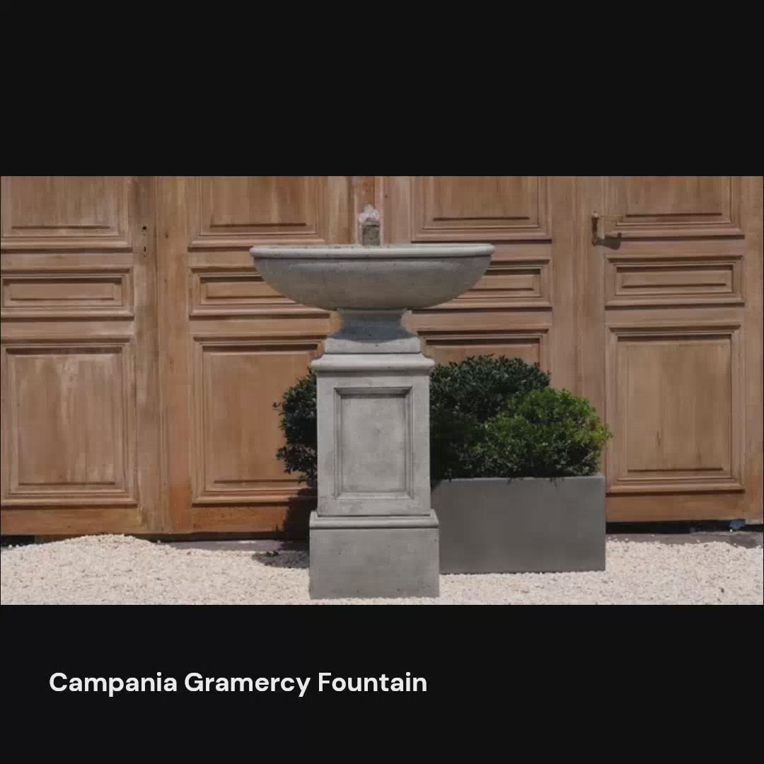 Derived from the ancient French term for "many thanks," the Gramercy Fountain by Campania features minimalist bowl design with a raised copper water spout as its primary focal point. The modernity of the bowl transitions well upon the classically designed pedestal. Water bubbles down from all sides, creating a beautiful sight from any angle.