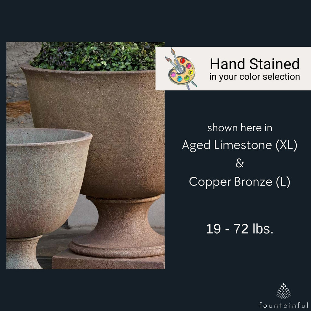 Each Hampstead Urn Planter is individually hand built of high-density cast stone concrete and rated for both indoor and outdoor use. Choose any color stain from the Campania palette to compliment your decorative theme.