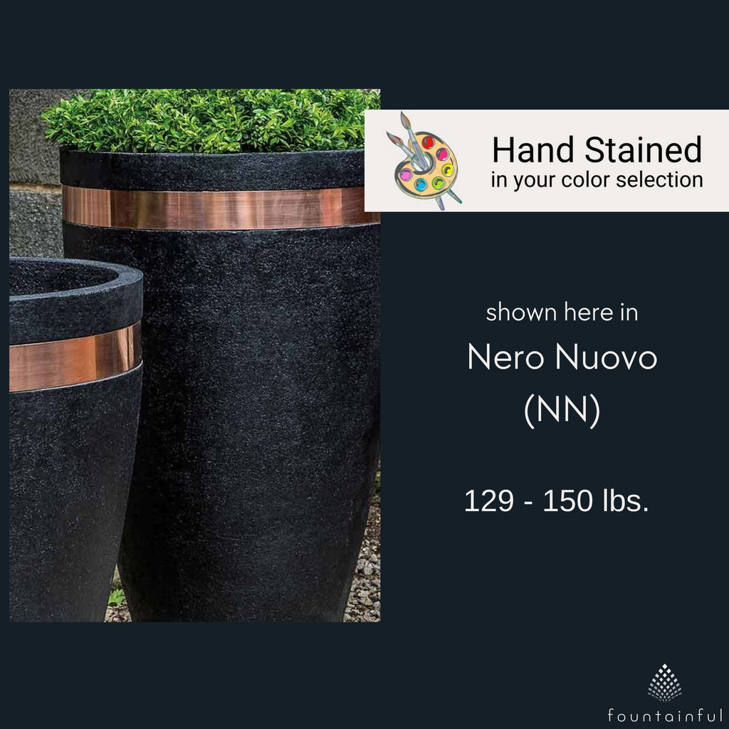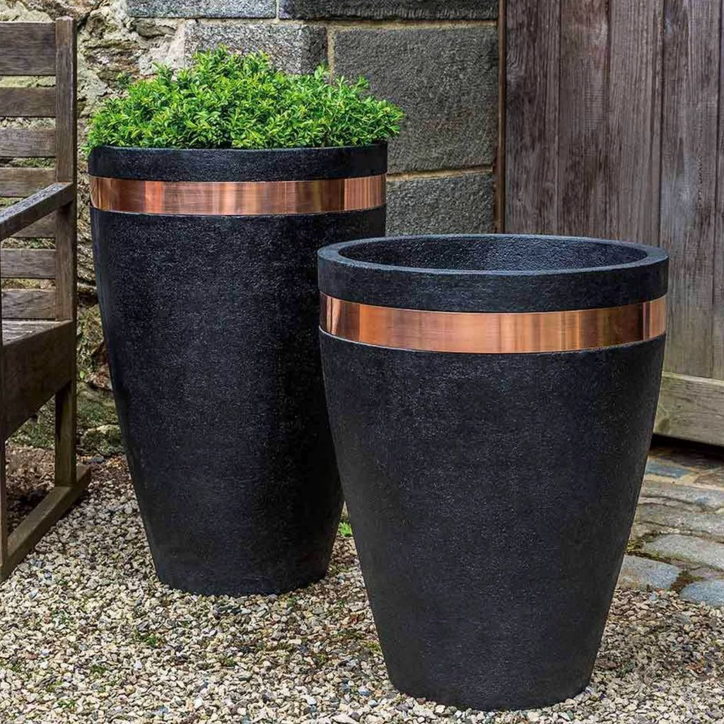 The Moderne Tapered Planters by Campania features a tapered vase design with a striking, real copper band encircling the top. The remaining surface of the vase is left free from accents. Enjoy the contemporary charm and craftsmanship of these 129 and 150-pound concrete planters. Display on a patio, porch, garden, and more!