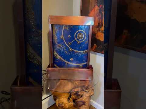 The Celestial Machinations Tabletop Fountain by artist Cameron Harvey draws inspiration from the star maps of the Renaissance period. Part sculpture, part fountain – the stars and gears are three-dimensional and sit atop the ultramarine background and gold stars. The backsplash is mixed material: acrylic and metals. The copper and bronze trim offer versatile placement options whether your décor is modern, rustic, or neutral.