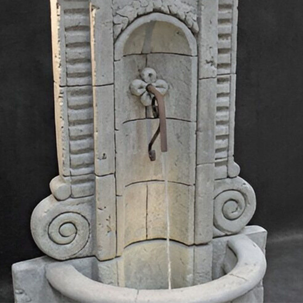 Named after the historic French province, the Champagne Tall Wall Fountain by Fiore Stone features ornately sculpted scrollwork and a central archway as its primary focal point. Water jets out from the centrally mounted rustic iron water spout. This fountain is ideal for sprucing up a plain fence or wall.