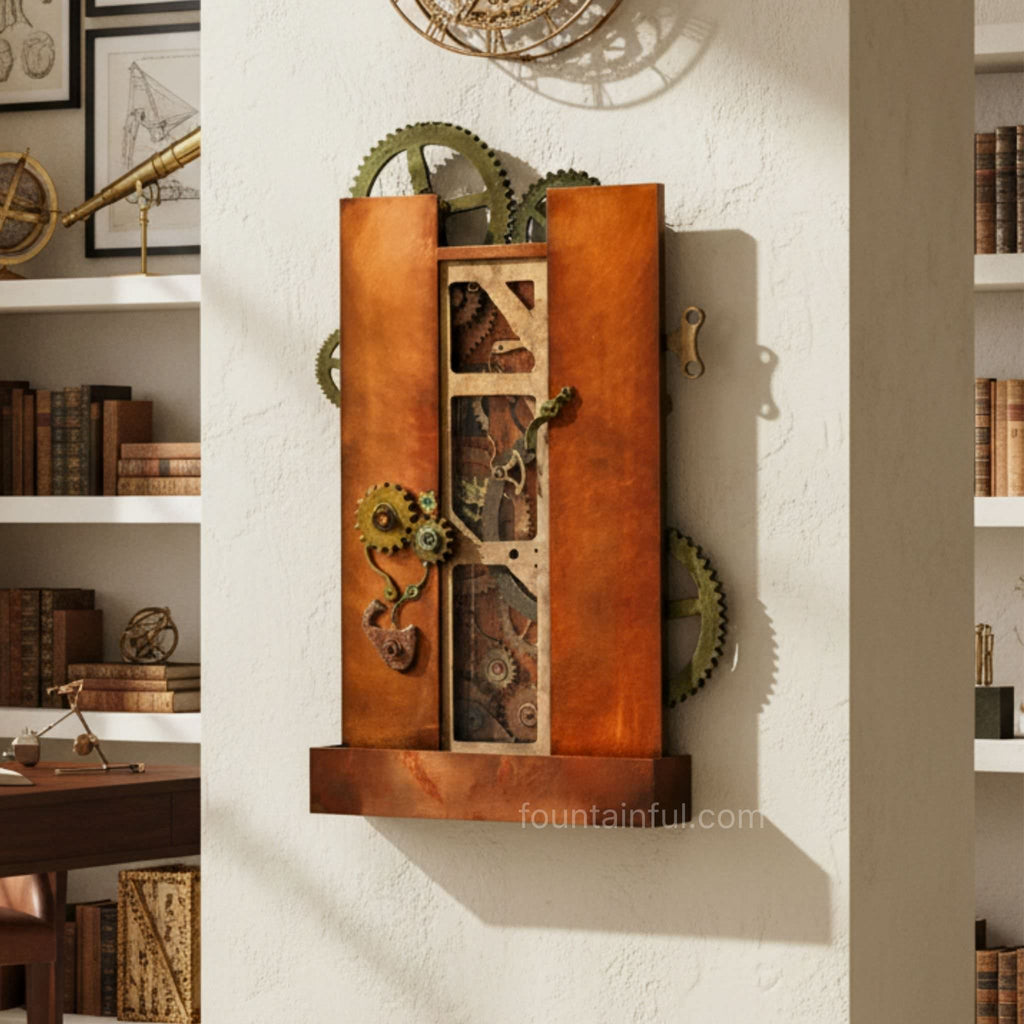 Exhibiting a magical, adult-storybook feel, the Da Vinci Decoder Wall Fountain by artist Cameron Harvey features gears and hidden sun and moon faces. Made entirely from copper and other metals, this fountain is a conversation piece reminiscent of an old-world astronomical device worthy of Leonardo da Vinci himself. You'll never see another water feature like it.