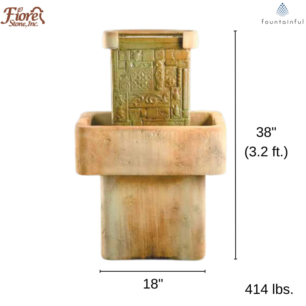 The Mosaic Wall Fountain by Fiore Stone features a hieroglyph inspired backsplash with masterful detail. The pedestal and water pool are left free from ornamentation, letting the backsplash serve as the main focal point. This fountain is ideal for sprucing up a fence or wall.