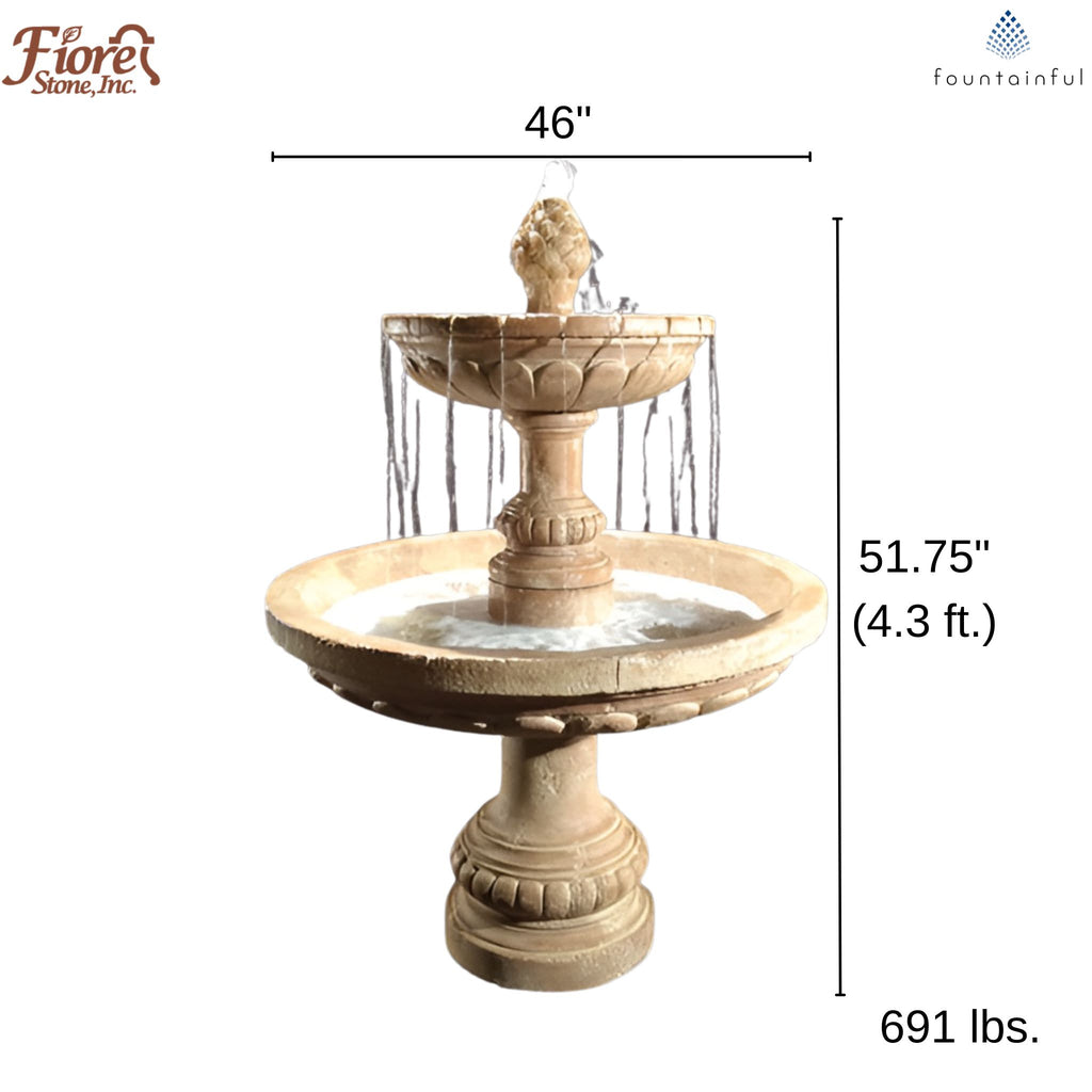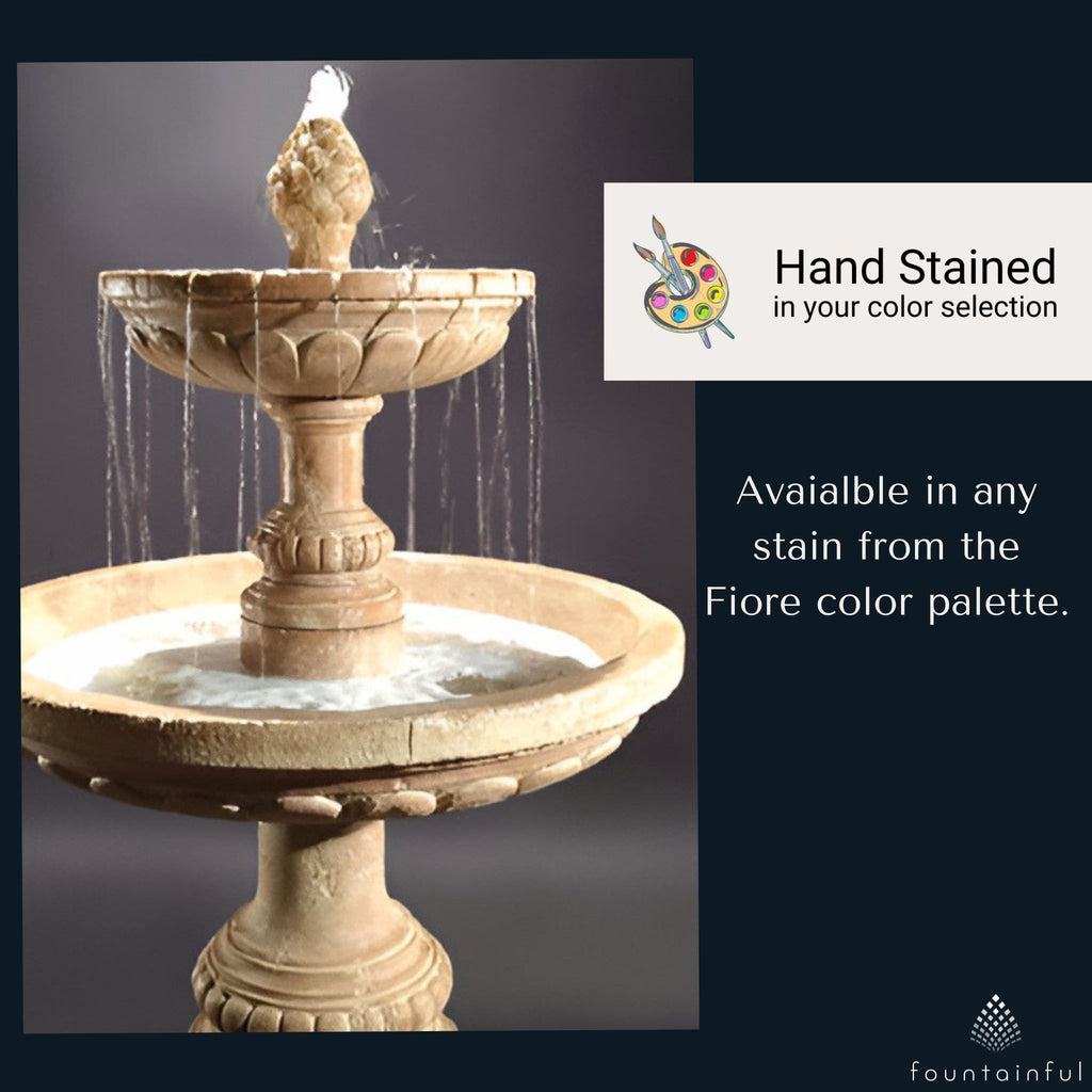 Named for the Swiss Alpine city, the Geneva 2-Tier Fountain by Fiore Stone features a classical design with sculpted scrollwork and adornments on the pedestals and bowls. The fountain is crowned with a pinecone finial. Water cascades down all sides, creating beautiful focal points from every angle.