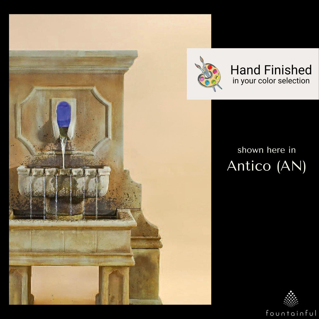 Named for the ancient city on the Italian Riviera, the Savona Wall Fountain with Legs by Giannini features a regal design with a minimalist backsplash and 7 cascading water points from the main spout and through the upper bowl. The basins and backsplash sit on legs that help create a truly stunning centerpiece for any garden.
