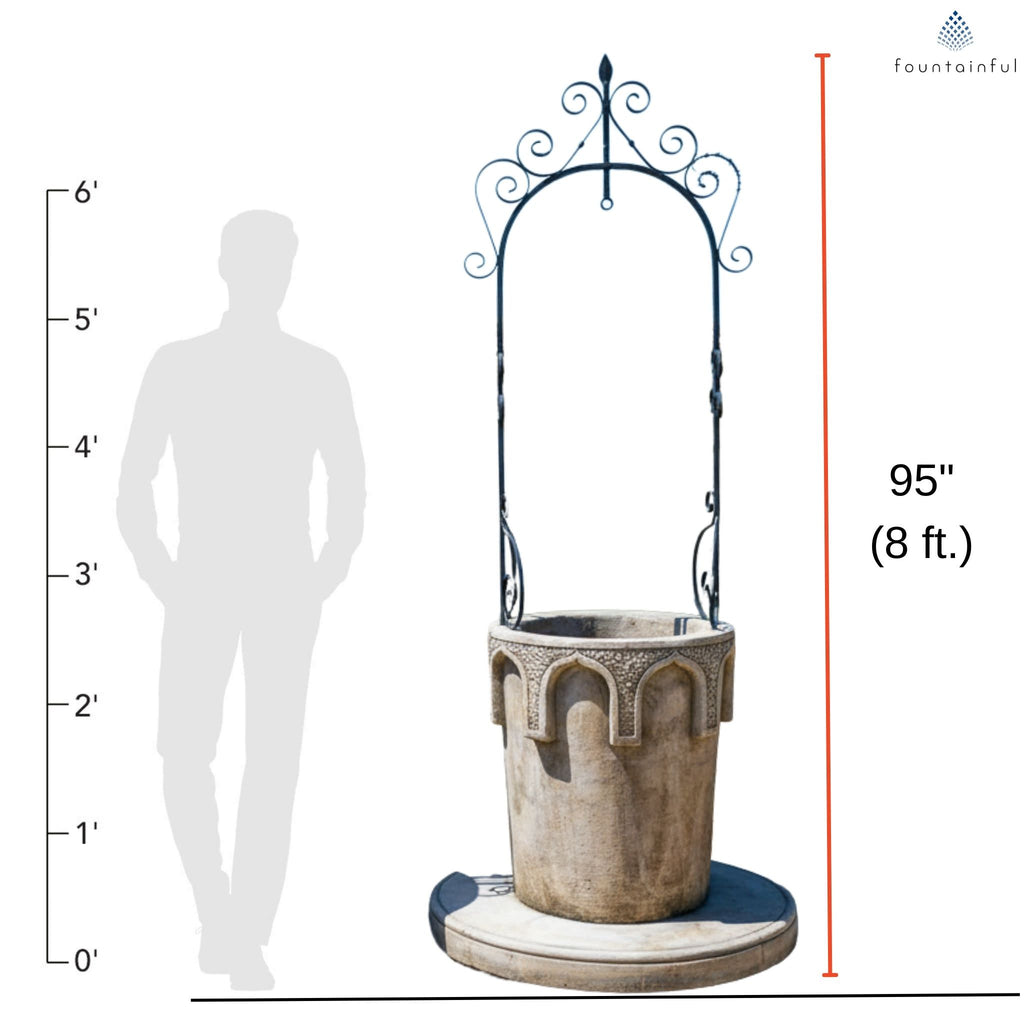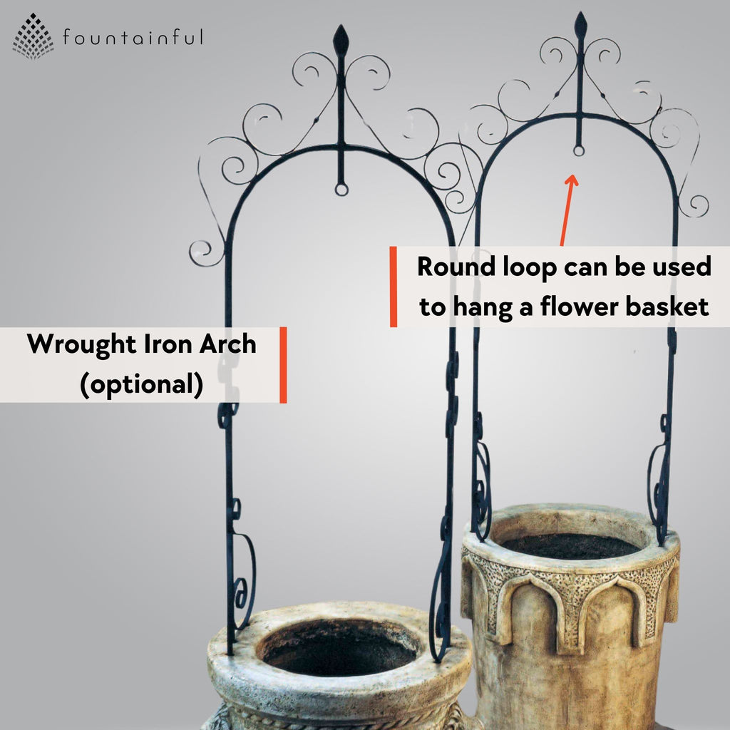 Each wishing well is available with an optional Wrought Iron Arch that takes the total height to 8-feet. Enjoy the old world charm and durability of these 450-pound concrete wishing wells.
