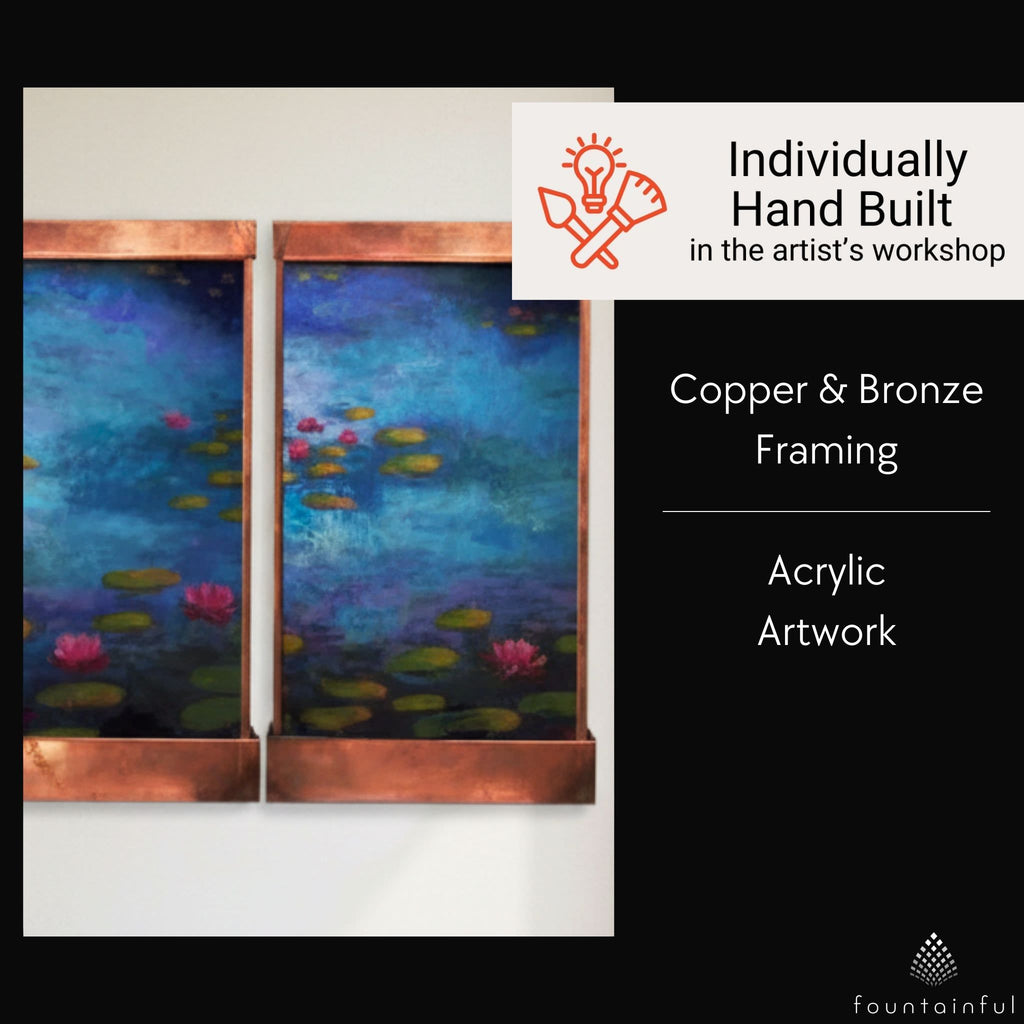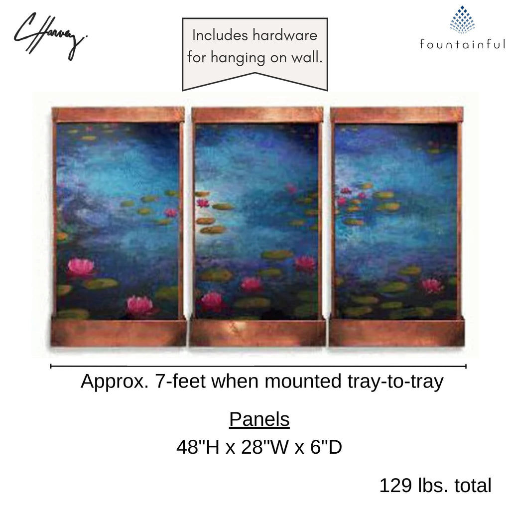 Inspired by the renowned works of Claude Monet, the Giverny Triple Panel Wall Fountain by artist Cameron Harvey features a beautiful scene of waterlilies in a pond of layered blue hues. The backsplash is acrylic, while the copper and bronze trim offers versatile placement options whether your décor is modern, rustic, or neutral.