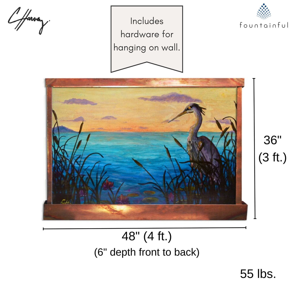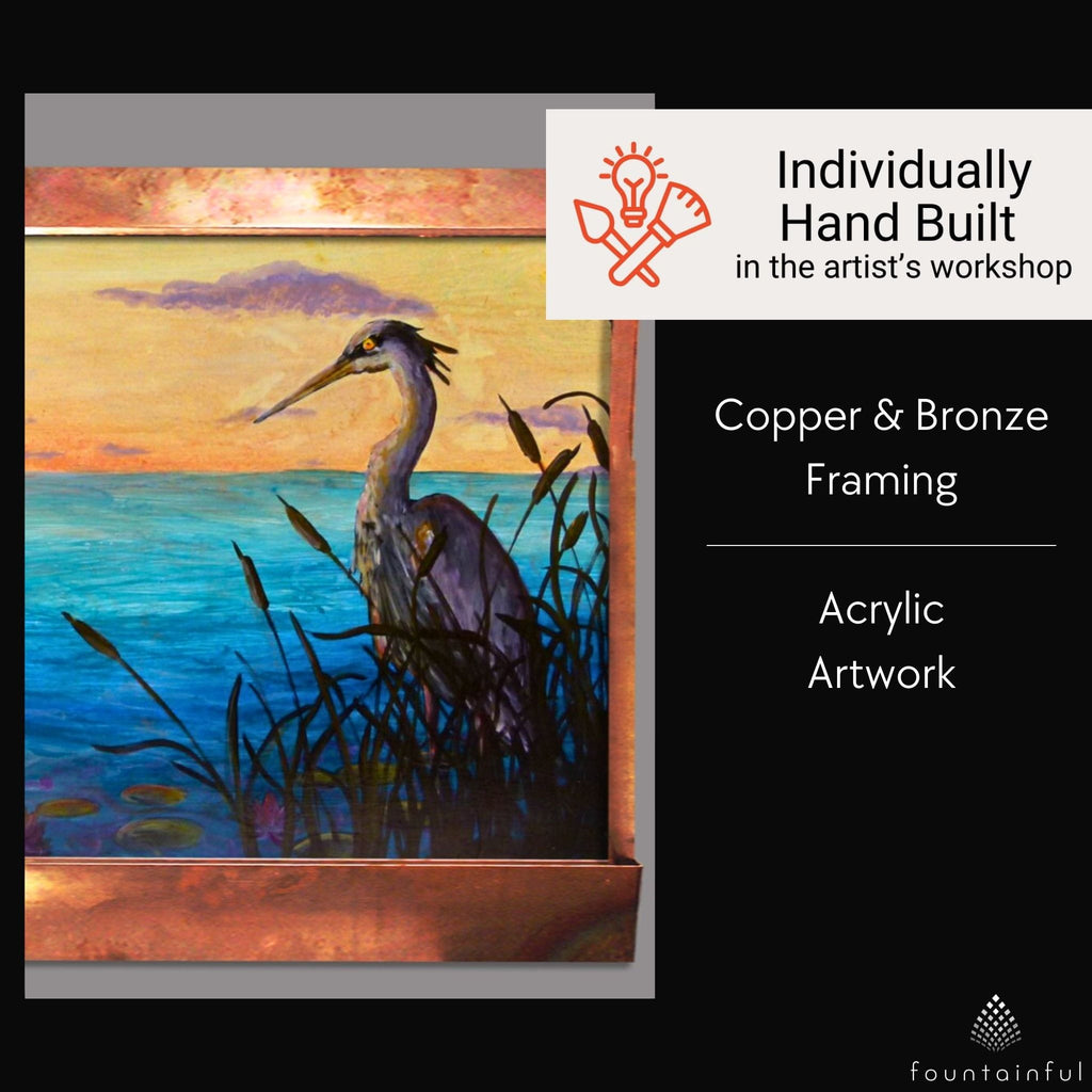 The Blue Heron Wall Fountain by artist Cameron Harvey pays homage to the majestic wading bird in vibrant detail. Depicting a heron just before sunrise, the effect created by cascading water only adds to the fountain's natural beauty. The backsplash is acrylic, while the copper and bronze trim offers versatile placement options whether your décor is modern, rustic, or neutral.
