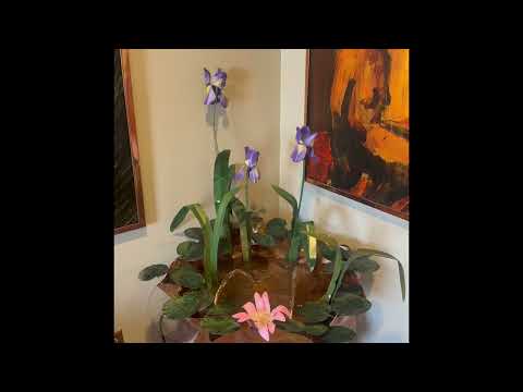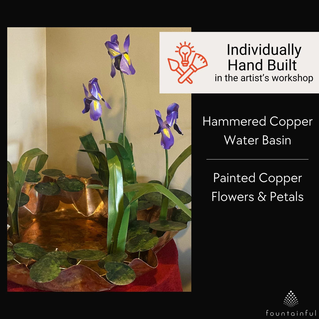 Inspired by the American southwest, the Helena Iris Fountain by Cameron Harvey features sculpted lily pads accented by 3 purple and 1 pink flower. The water basin is real copper that has been hammered by hand.