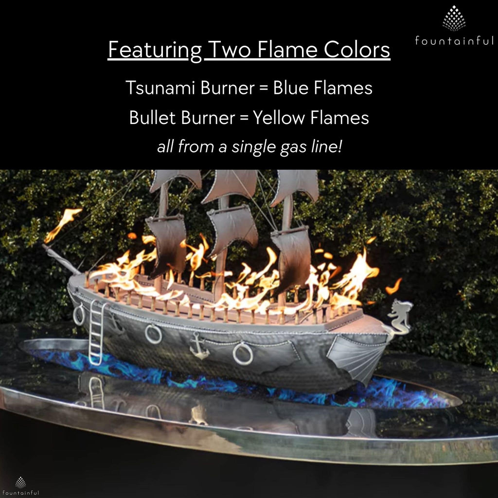 As shown in the designated photo and video, La Pinta utilizes two burners. The Tsunami Burner produces blue flames for the "sea" while the Bullet Burner® produces yellow flames for the ship. Best of all? It all works from a single gas line!