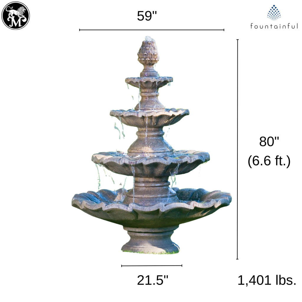 Enjoy the impressive stature and durability of this 1,401 pound cast stone concrete outdoor fountain. Includes pump.