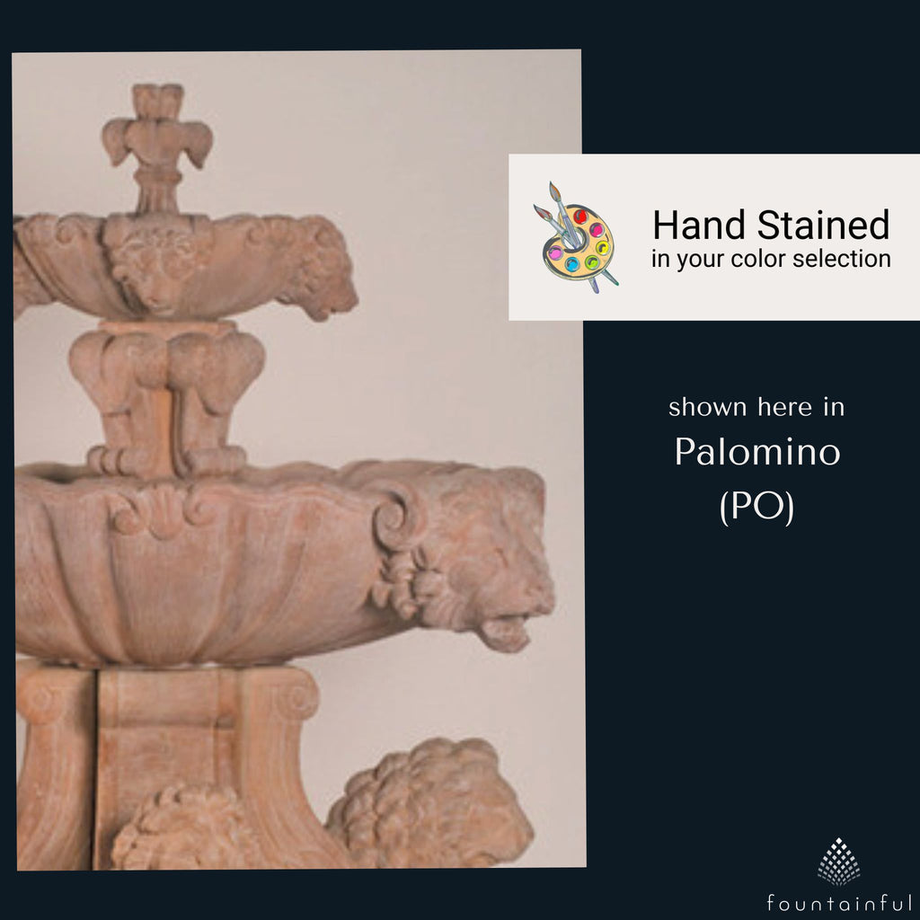 The Large Lion 2-Tier Fountain by Fiore Stone features 4 masterfully sculpted full-body lions around its base and 8 total lion heads around its bowls. Water flows down the top tier on all sides, creating beautiful focal points from any direction.