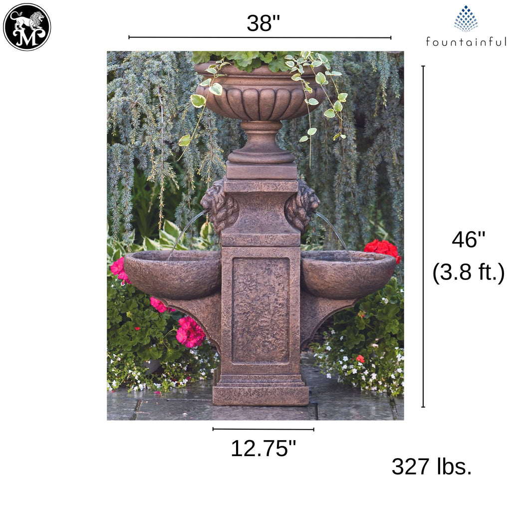 The Lion Head 2-Bowl Water Fountain with Milano Urn from Massarelli's Fountains features two large sculpted lion heads. Water spouts from the mouth of each lion, creating beautiful focal points on opposite sides of the fountain. The urn can be used as a planter.
