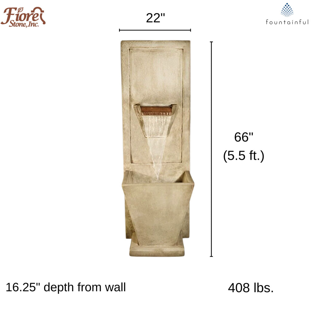 The Malibu Wall Fountain by Fiore Stone features a contrasting geometric design. The backsplash is free from ornamentation and accented by a copper spillway, which creates a striking central focal point. This fountain is ideal for sprucing up a plain fence or wall.