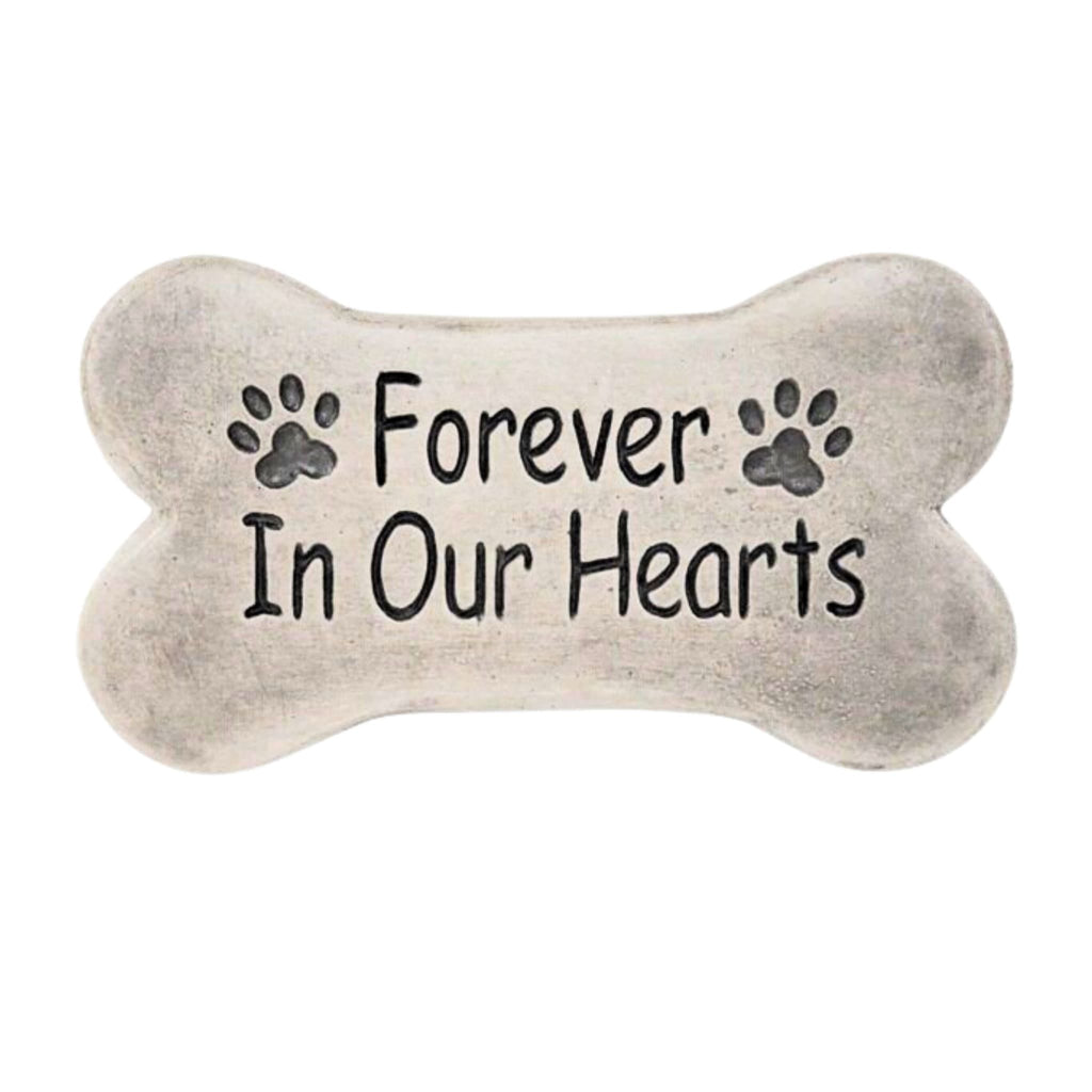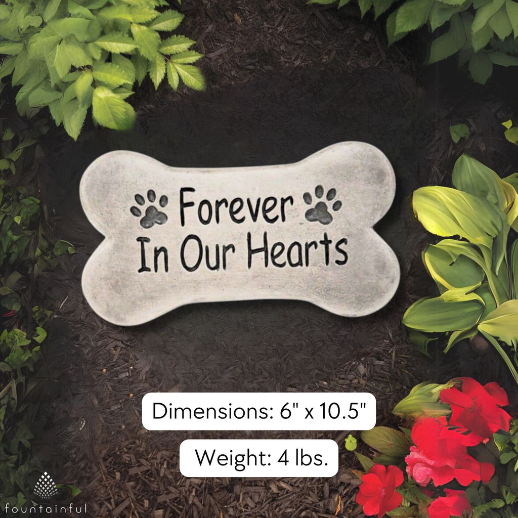 Each Garden Greeting Stone by Massarelli's is individually built, stained, and stenciled by hand. Designed with a bone shape and texture of natural stone, this greeting celebrates the memories of a dog with two pawprints and the inscription "Forever In Our Hearts" across its surface.