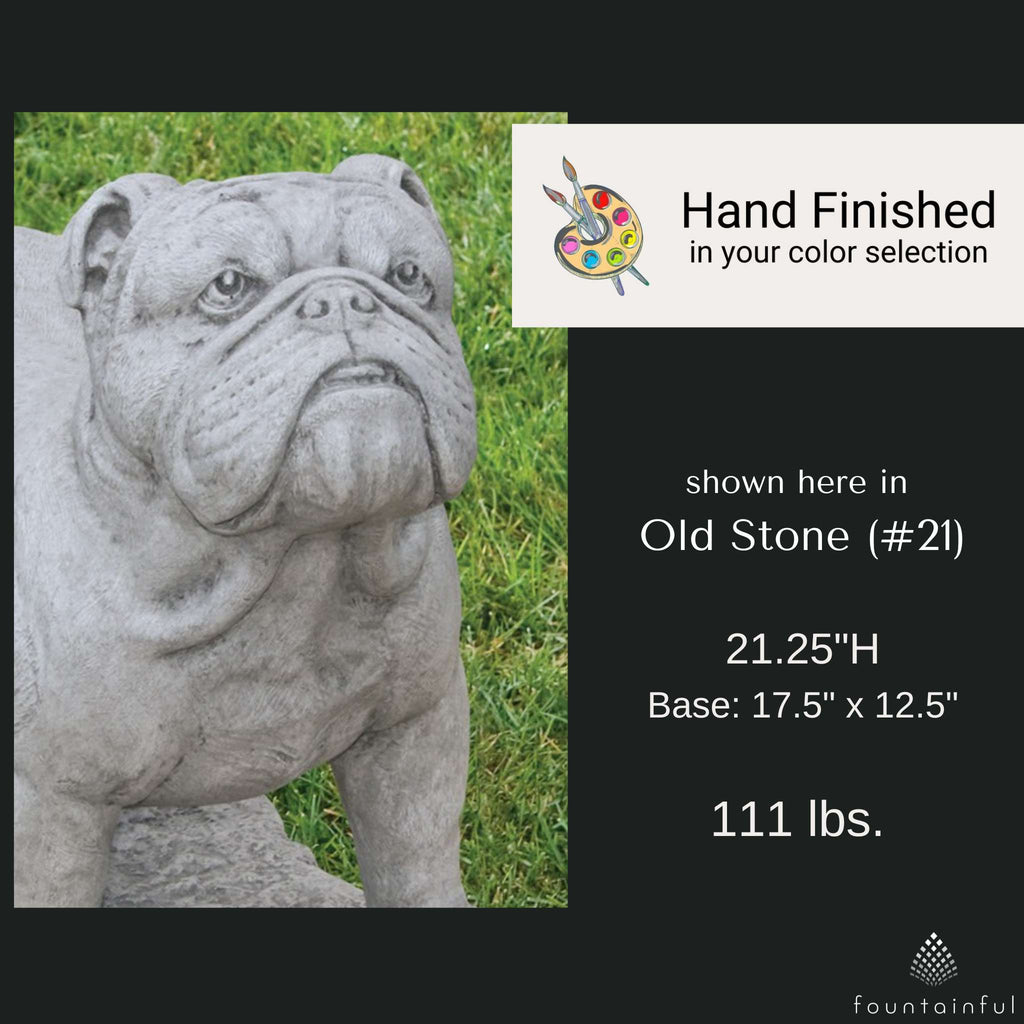 Each English Bulldog Statue is individually hand built of cast stone concrete and rated for both indoor and outdoor use. Choose from the full range of Massarelli's color finishes to compliment your decorative theme.