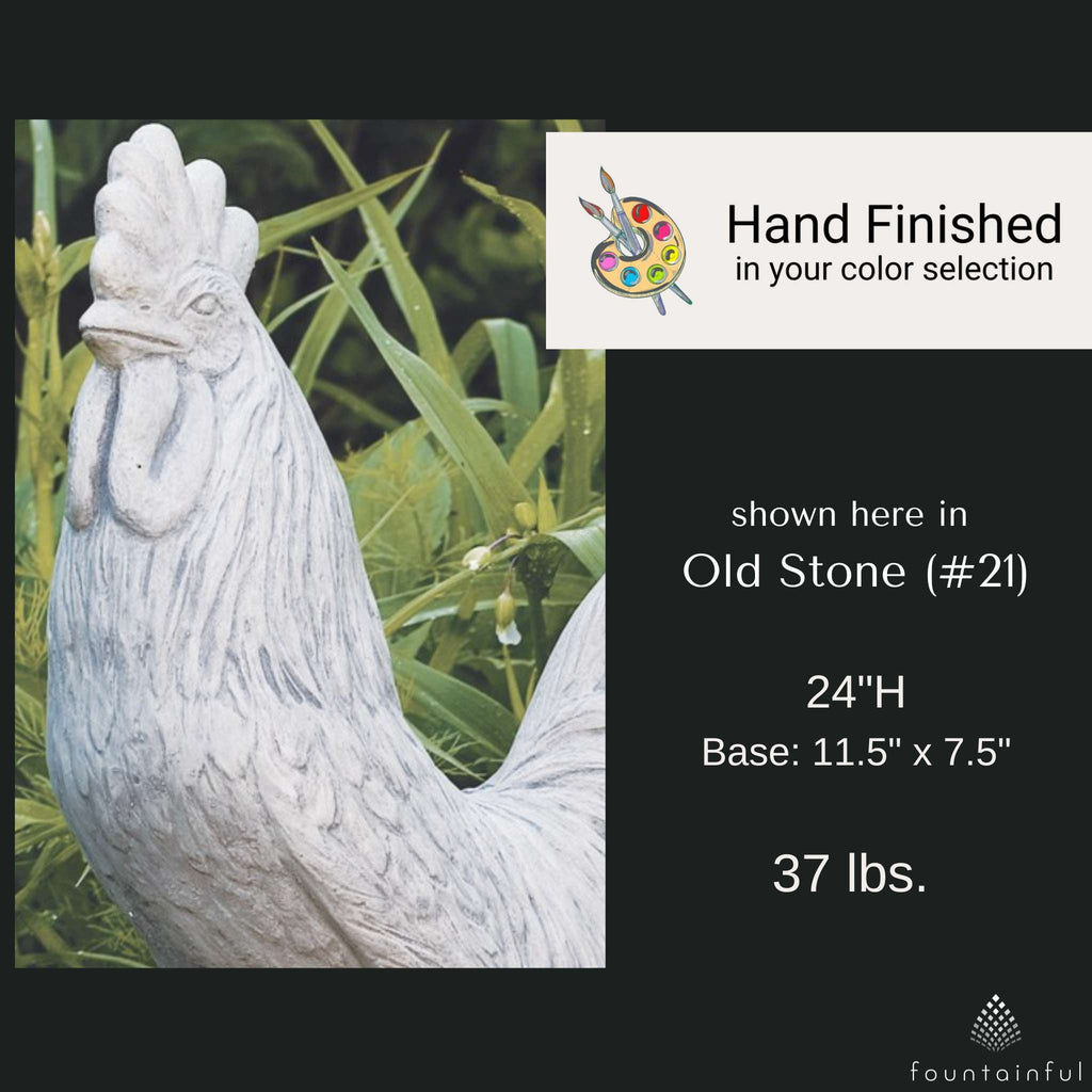 Each Large Rooster Statue is individually hand built of cast stone concrete and rated for both indoor and outdoor use. Choose from the full range of Massarelli's color finishes to compliment your decorative theme.