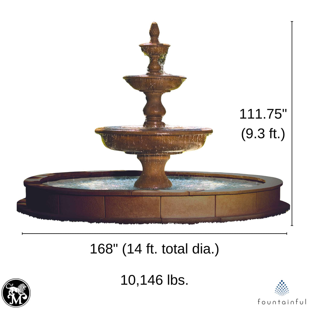 Enjoy the Italian charm and fine craftsmanship of this 10,146 pound cast stone concrete outdoor fountain with 12-foot diameter pool (14-foot total diameter with concrete caps). Includes pump.