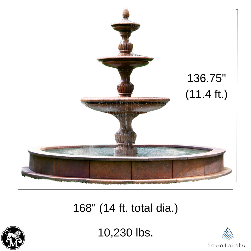 Named after the Northern Italian seaport village, the Savona 3-Tier Fountain with Pool by Massarelli's celebrates the region's timeless craftsmanship and passion for artistry. From its oversized tiers to the sculpted finial, this fountain creates a stunning 11-foot tall centerpiece.