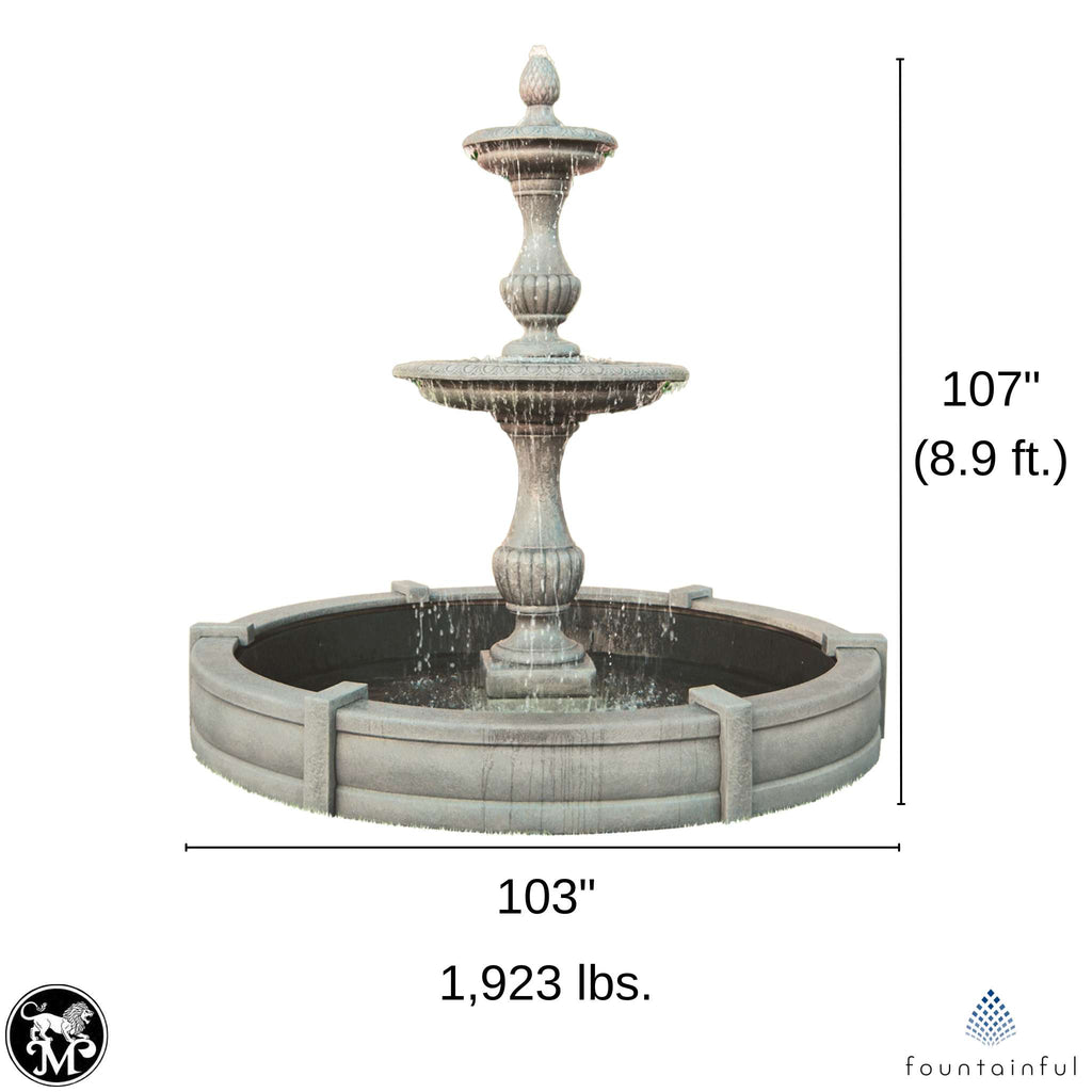 Enjoy the Mediterranean charm and craftsmanship of this 1,923-pound cast stone concrete outdoor fountain with 8-foot diameter pool (8.6-foot total diameter with concrete caps). Includes pump.
