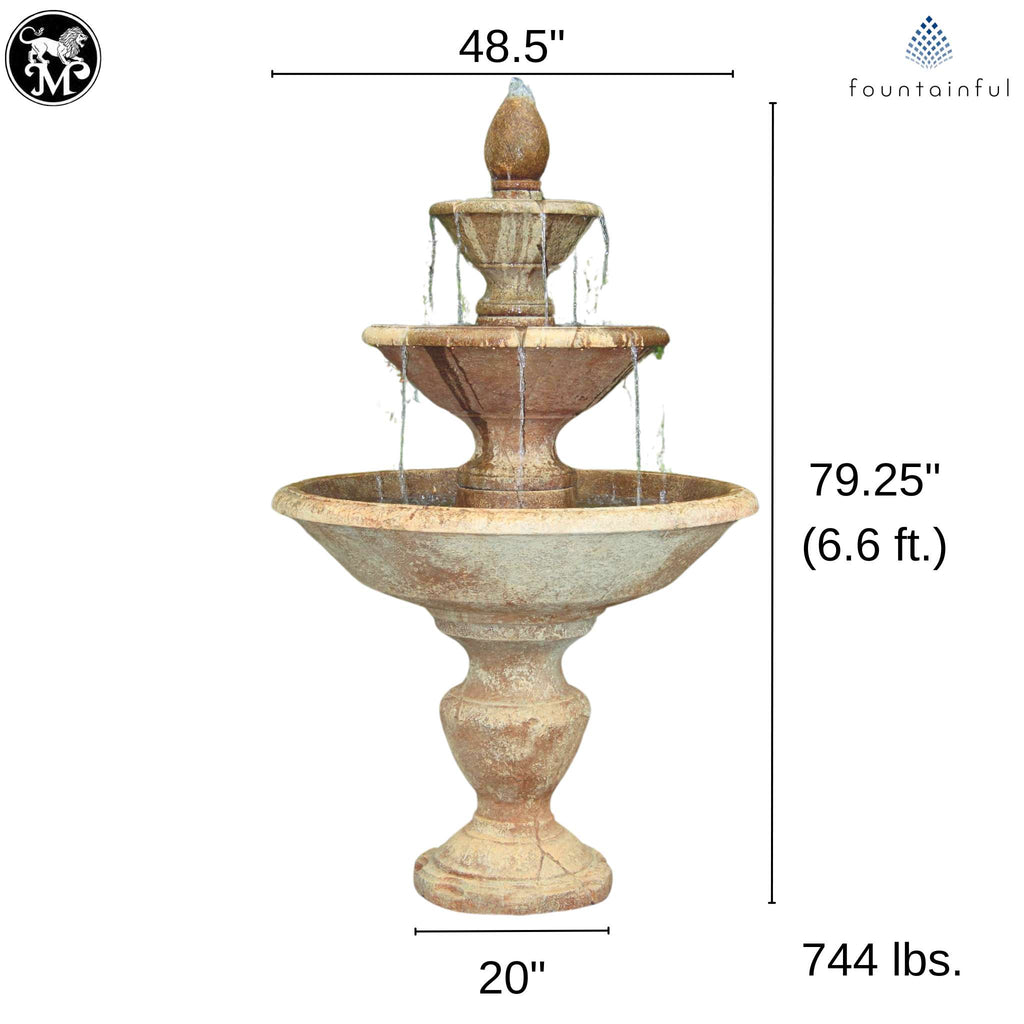 Water bubbles up from the plain pineapple finial and cascades down to the bottom level in concentrated streams. The strong ambient sounds of the Cortona 3-Tier Fountain promote relaxation and help mask unwanted noise.