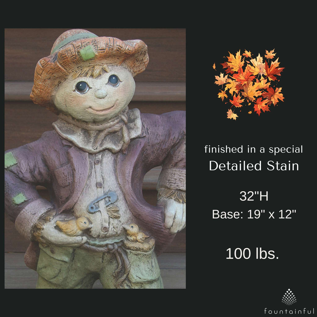 The Tall Scarecrow Statue by Massarelli's is masterfully sculpted to depict a scarecrow standing on a bed of foliage and fall leaves. Look closely: two birds are also incorporated into the design.
