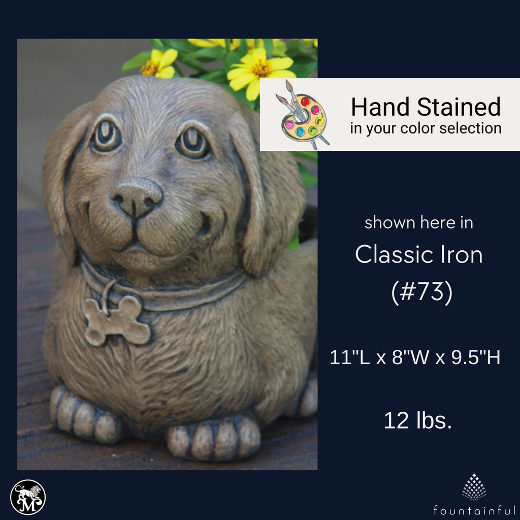 Waffles the Puppy by Massarelli's features an playfully sculpted dog character complete with a wishbone tag and wide-eyed expression. Enjoy the charm and craftsmanship of this 12-pound concrete planter. Display on your patio, porch, garden, tabletop, windowsill, and more!