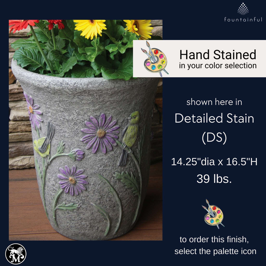 Each Songbird & Flowers Planter is individually hand built from concrete and rated for both indoor and outdoor use. Choose any color from Massarelli's palette to compliment your decorative theme. Select Detailed Stain for the whimsically painted songbird & floral accents shown in the photos.