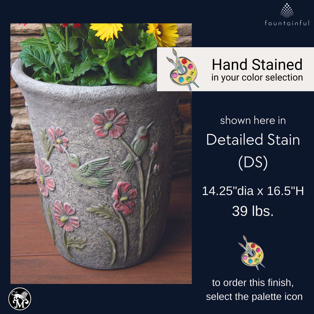 Each Hummingbird & Flowers Planter is individually hand built from concrete and rated for both indoor and outdoor use. Choose any color from Massarelli's palette to compliment your decorative theme. Select Detailed Stain for the whimsically painted hummingbird & floral accents shown in the photos.