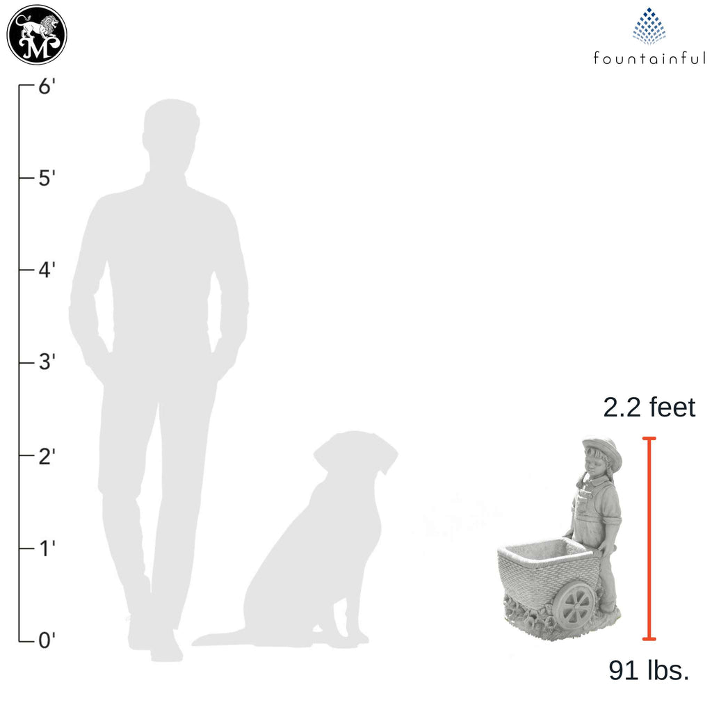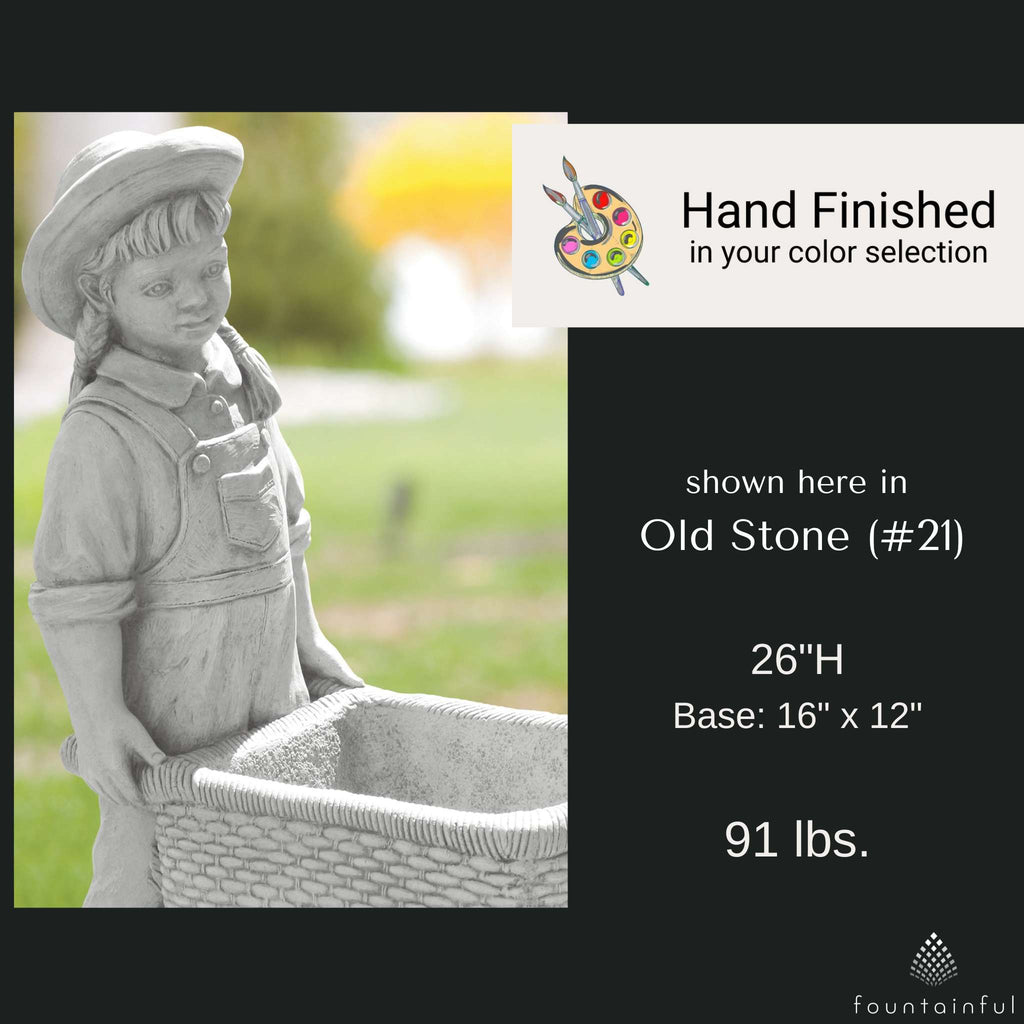 Each Girl with Flower Cart Statue is individually hand built of cast stone concrete and rated for both indoor and outdoor use. Choose from the full range of Massarelli's color finishes to compliment your decorative theme.