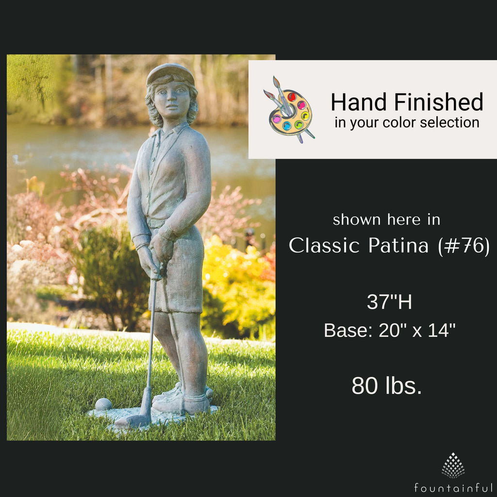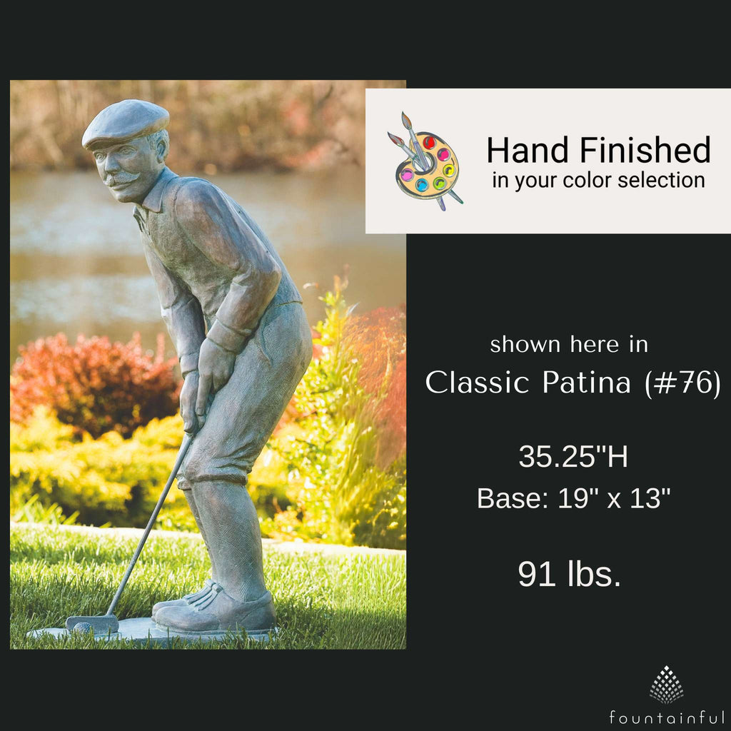 Each Nostalgic Golfer Statue is individually hand built of cast stone concrete and rated for both indoor and outdoor use. Choose from the full range of Massarelli's color finishes to compliment your decorative theme.