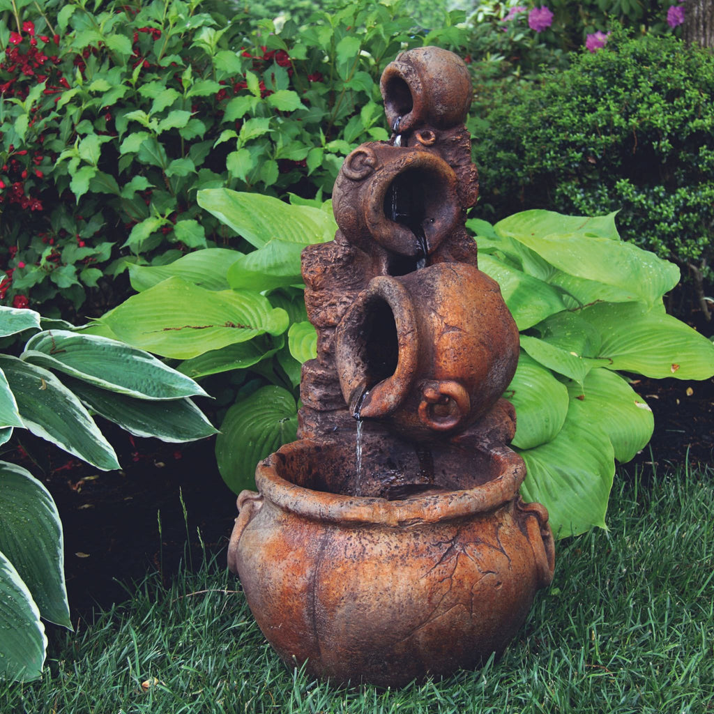Water flows out from the first urn and through the openings of each urn into the lower pool. The gentle ambient sounds of the Spilling Urn Fountain promote relaxation and help create a calming environment.