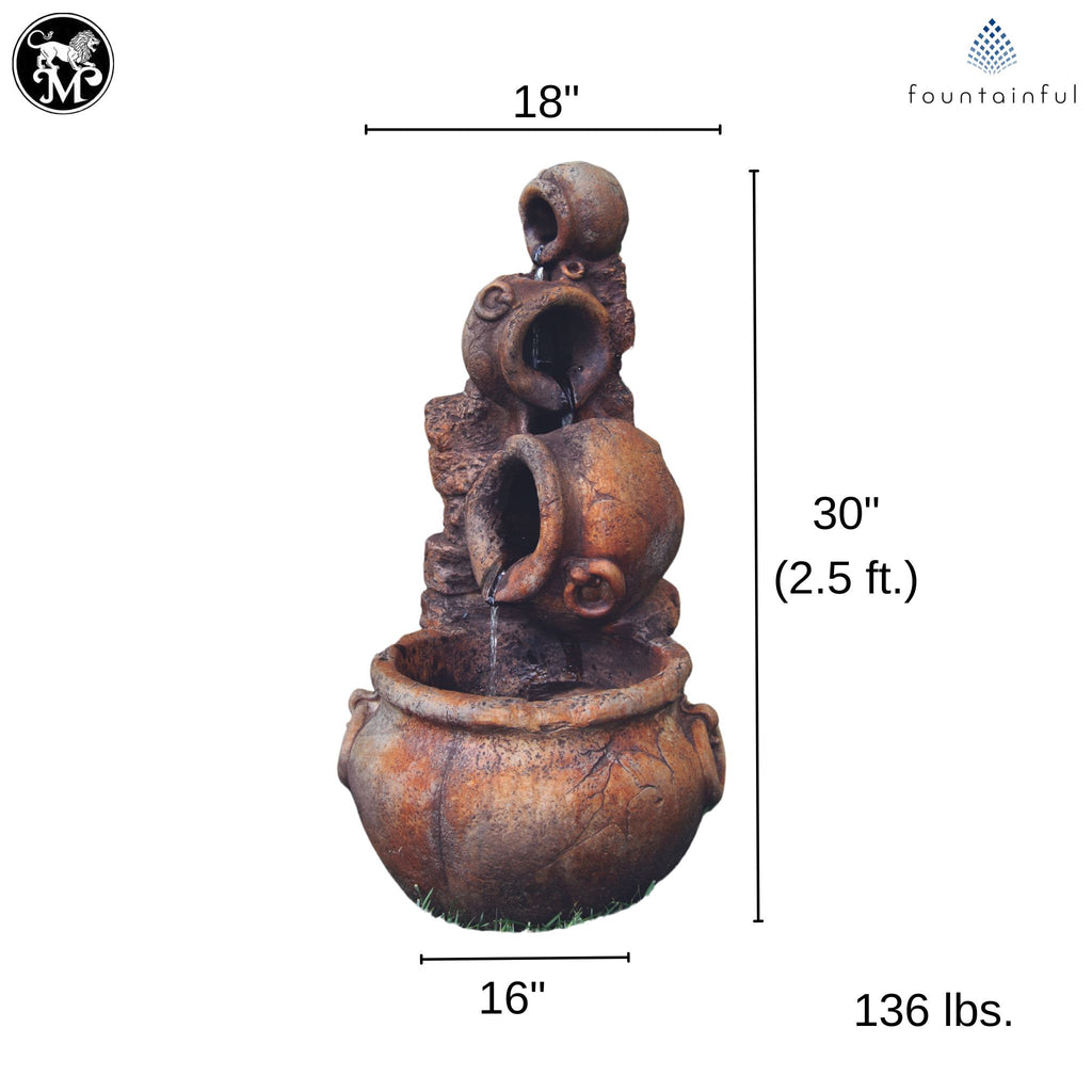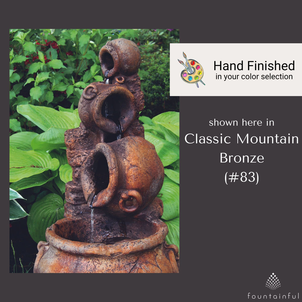 The Spilling Urn Fountain by Massarelli features 4 sculpted vessels designed with a distinctly old-world style. Water flows from urn to urn, creating a beautiful, singular focal point when viewed from the front.