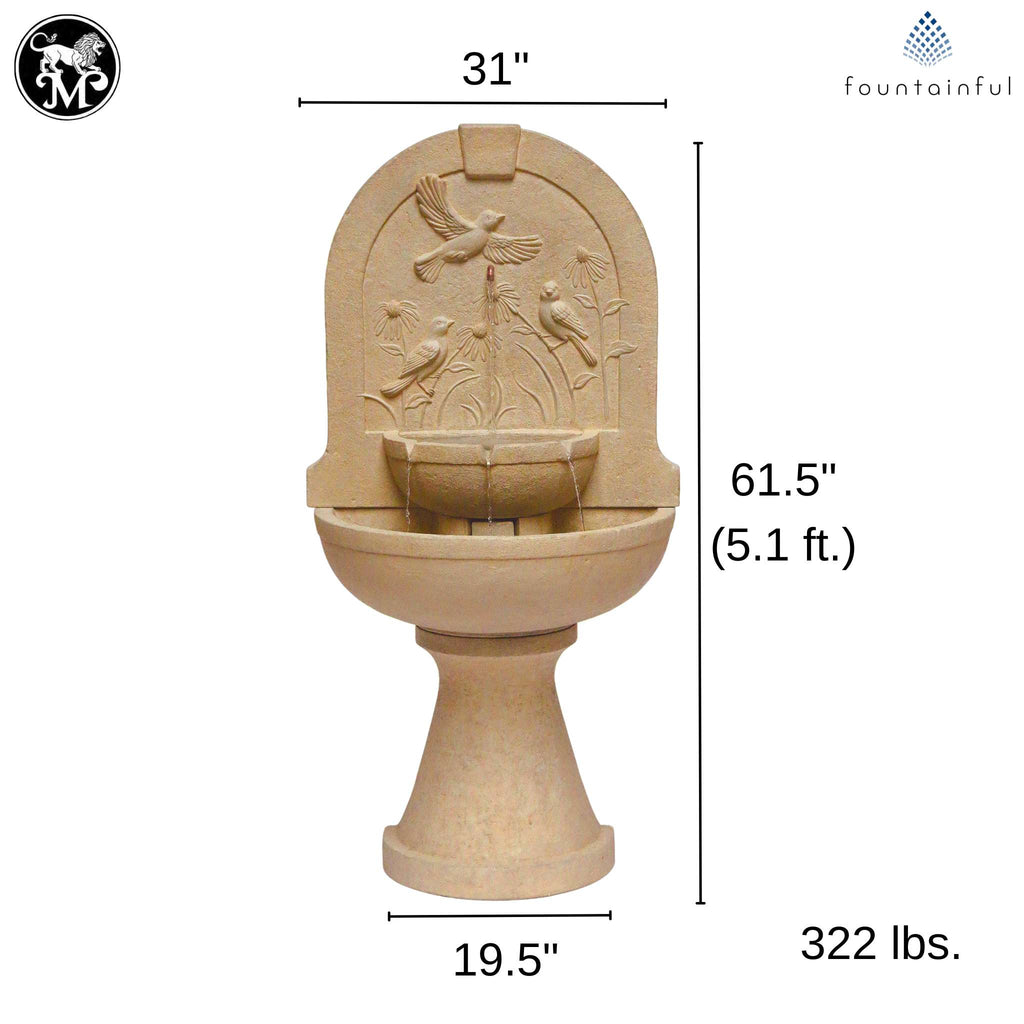 The Laveen Arch Bird Wall Fountain by Massarelli's Fountains features reliefs of birds gathered around daisies to make a beautiful backsplash. Water flows from both a copper spout and over the top tier, creating multiple focal points of sight and sound.