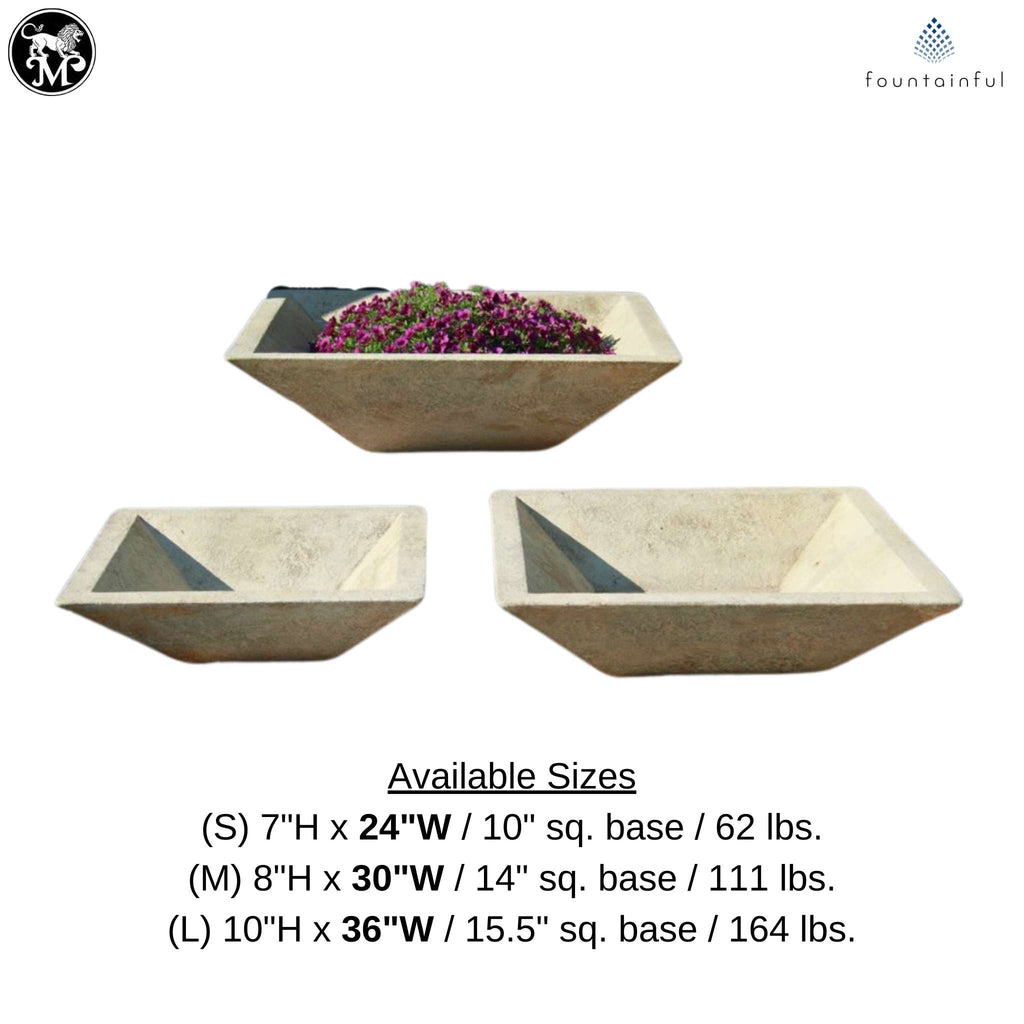 The Low Square Bowl Planters by Massarelli's feature a contemporary, tapered design intentionally kept at a lower height than man bowl style planters. The surface is left free from adornment and ornamentation. The planters are 62 lbs. - 164 lbs. of concrete, depending on the size selected. Display on your patio, porch, garden, and more!