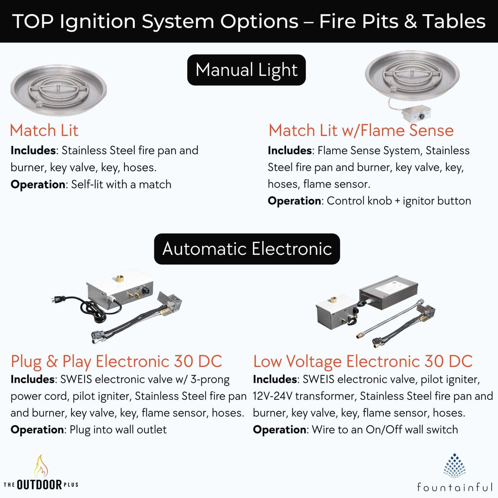 Match Lit w/Flame Sense (LC Certified) – A match-lit system fitted with a thermocouple flame sensor for an extra layer of protection against leaks or buildups. To operate, you'll light the fire pit with a control knob and ignitor button. If the sensor doesn't detect a flame, the fuel supply will automatically close. Includes: Pan, Burner, Gas Orifice, Gas Hoses, Key Valve, Key, Flame-Sensing System.