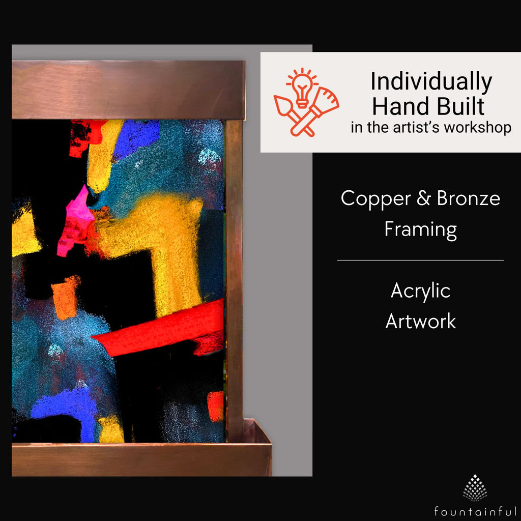 Rich blues, deep reds, and luminous golds come together in Nocturne, an abstract tabletop fountain by Cameron Harvey inspired by the quiet intensity of evening. The composition suggests movement and emotion, allowing color to take center stage as water cascades across the surface. The backsplash is acrylic, while the copper and bronze trim offers versatile placement options whether your décor is modern, rustic, or neutral.