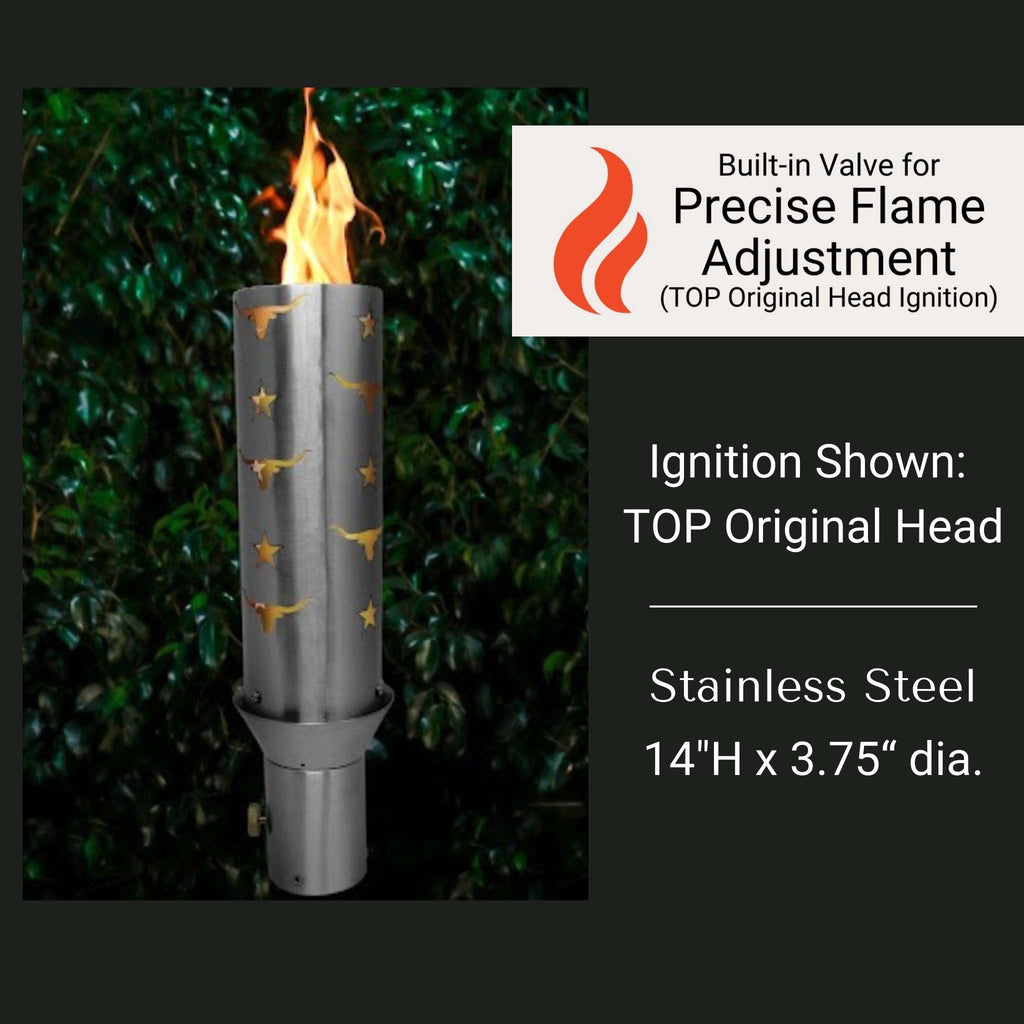 The Bull & Star Fire Torch by Outdoor Plus is a ranch-inspired design with a steer head and star pattern through which the flame illuminates. Durable and resistant to corrosion thanks to its high-grade 304 stainless steel construction.