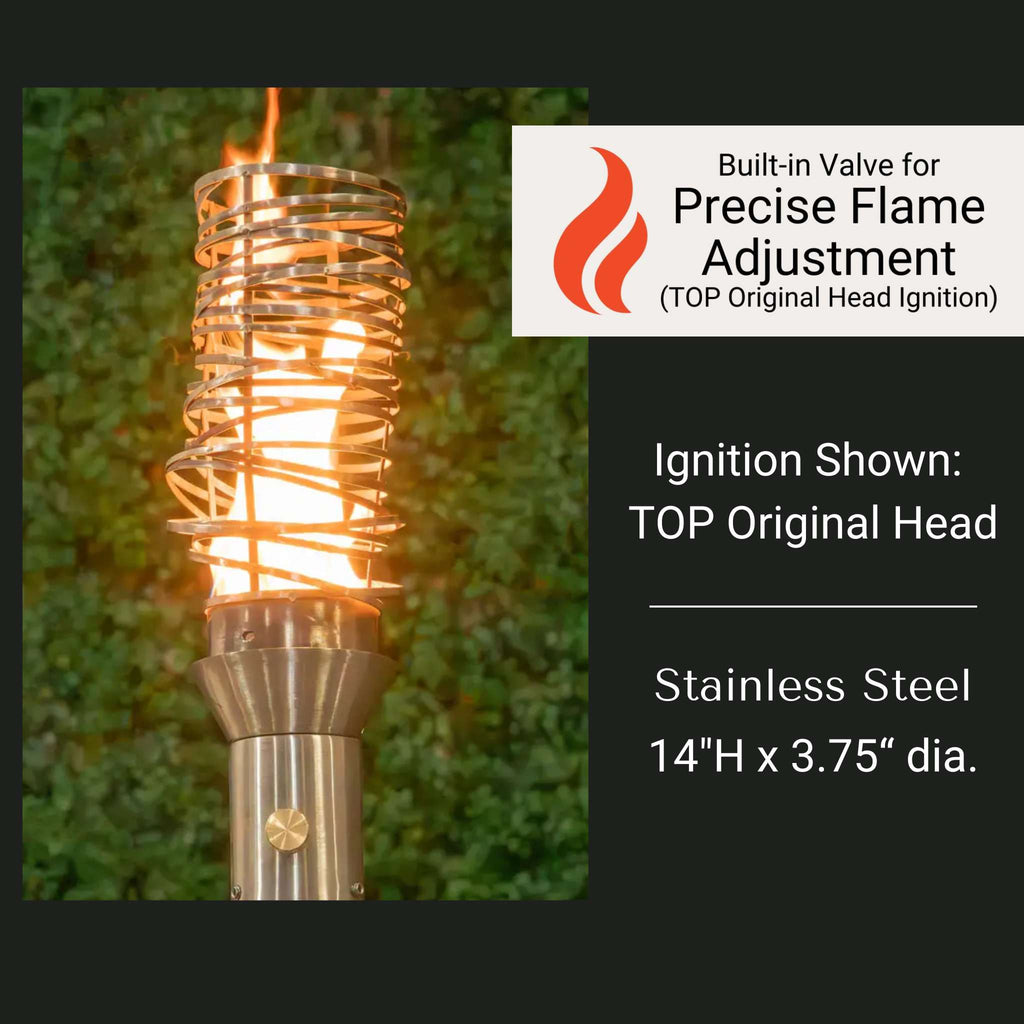 Ignition Options TOP Original Torch Head: Best for Torches installed with a hidden gas line. 3/8” Flared Gas Connection; Compatible with In-Ground Post, Column Mount, Propane Stand; Built-In Gas Valve for Flame adjustment.