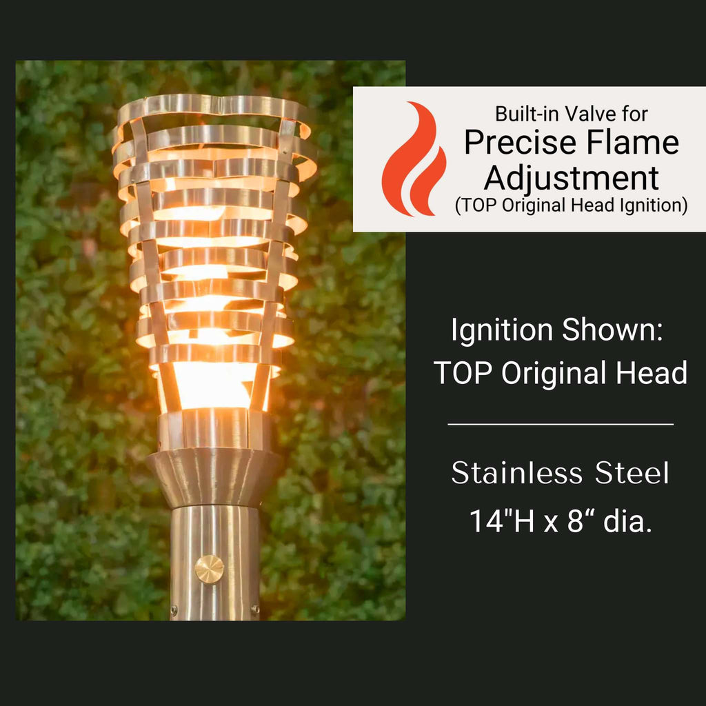 Individually hand built from stainless steel, the quality of this torch is vastly superior to thatched tiki varieties. Available in 1 of 2 ignition types (see designated image and Specs Table for details). Illuminate a pool area, patio, garden fountain, and more.