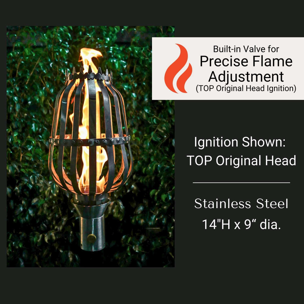 Ignition Options TOP Original Torch Head: Best for Torches installed with a hidden gas line. 3/8” Flared Gas Connection; Compatible with In-Ground Post, Column Mount, Propane Stand; Built-In Gas Valve for Flame adjustment.
