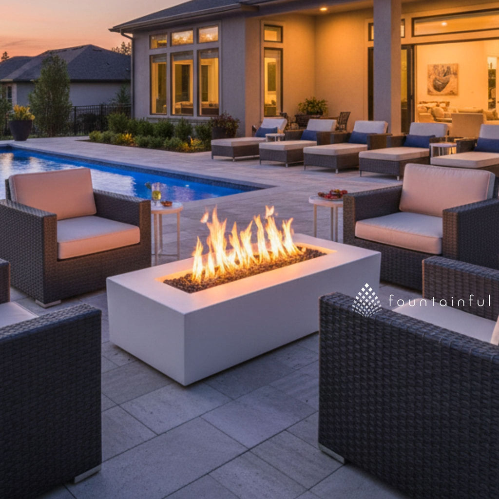 The Regal Fire Pit by The Outdoor Plus is a beautiful accent piece featuring a sleek rectangular design built from Glass Fiber Reinforced Concrete. Known for being among the strongest in the industry, the propriety GFRC formula adds natural beauty and longevity to this fire pit. Includes lava chunks.