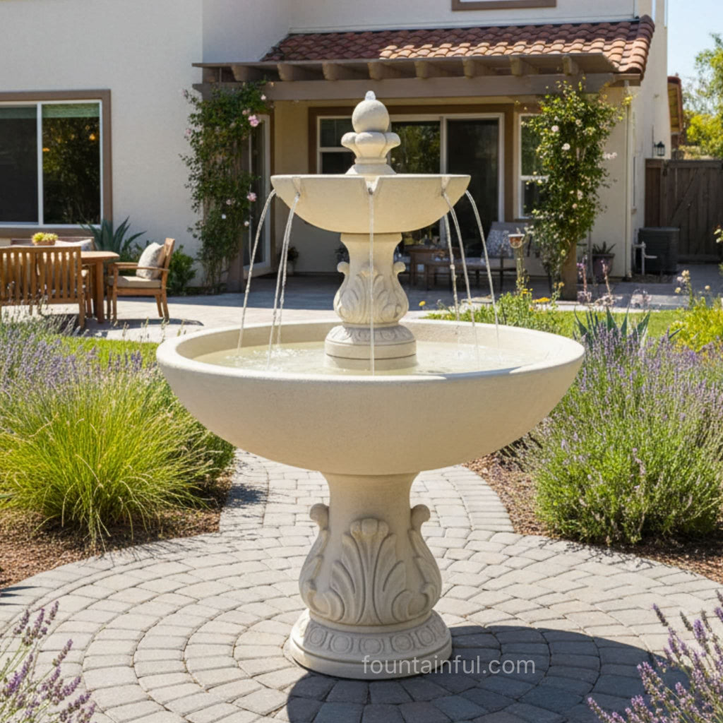 Water bubbles up from the finial and cascades from the top tier in concentrated streams to the pool below. The moderate ambient sounds of the Riviera 2-Tier Fountain promote wellbeing and may help mask certain unwanted noise.